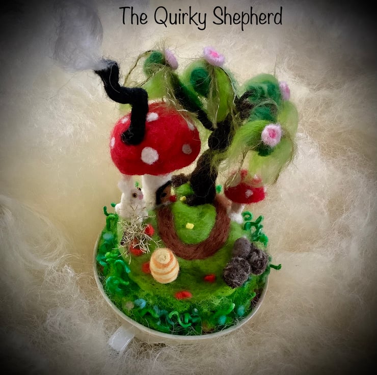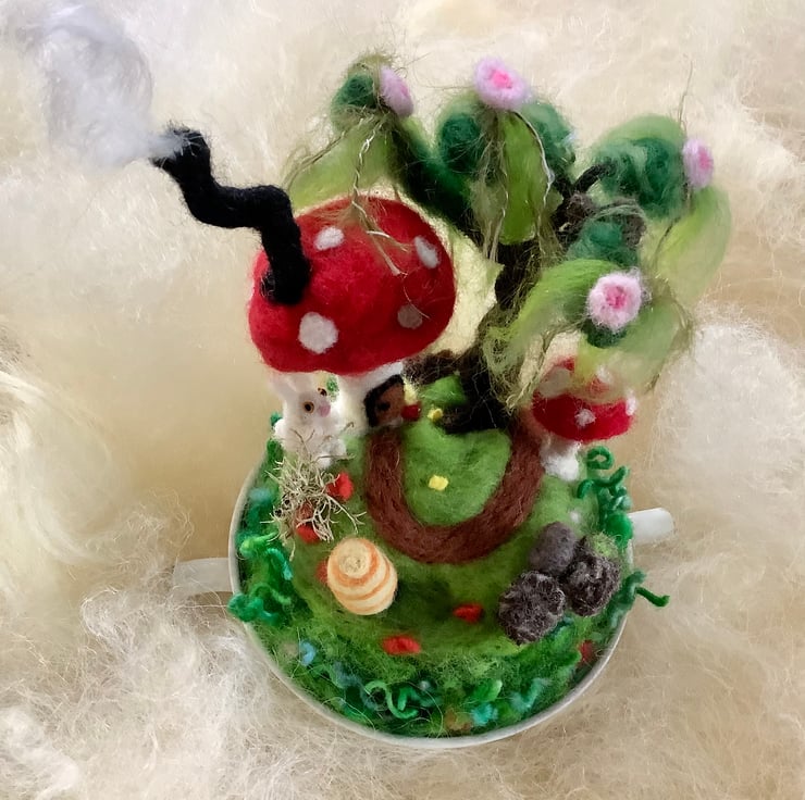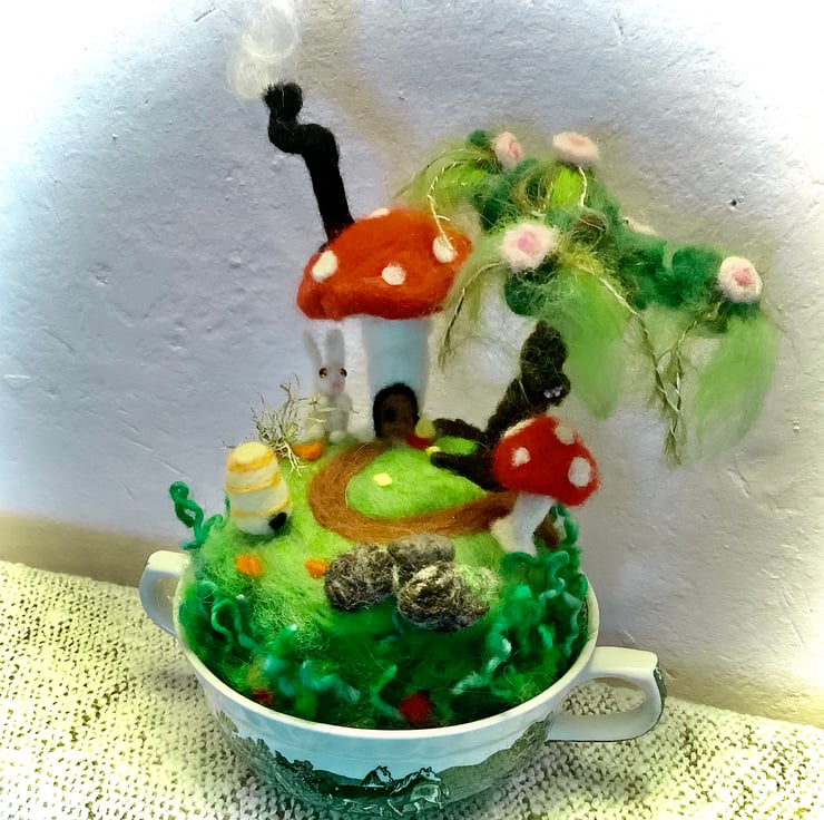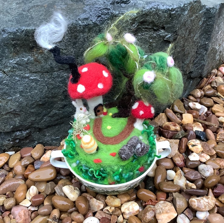 The toadstool garden has been crafted from pure wool ... but who lives in the toadstool house? A bunny visitor has come a calling ... is anyone at home? SOMEONE is home because there is smoke coming from the chimney; it will be cosy and warm inside.