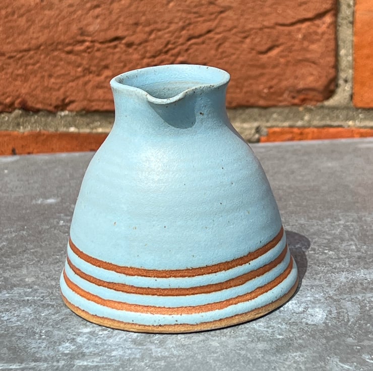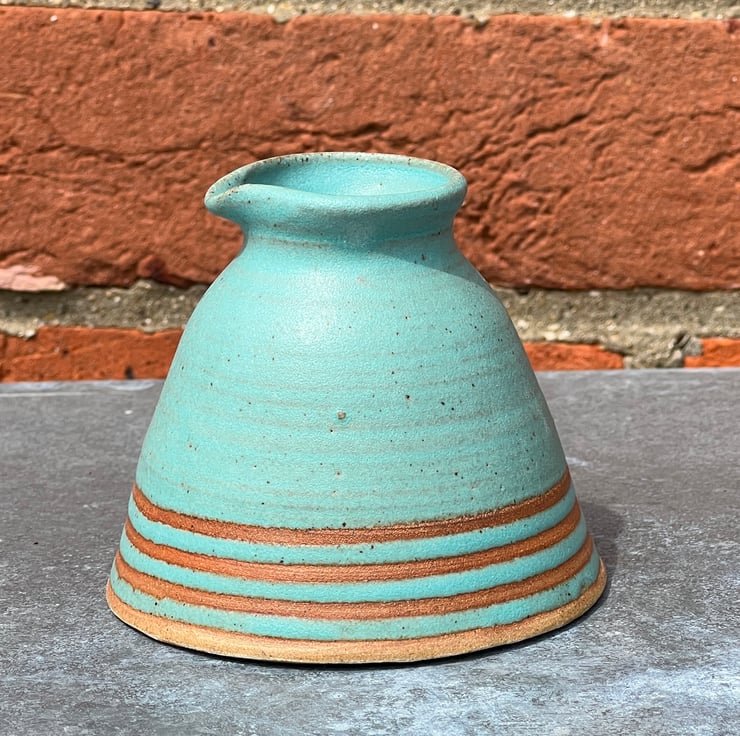 Hand thrown Posy jug available in a variety of pretty colours with tape resist detail revealing toasted raw clay. Handle less