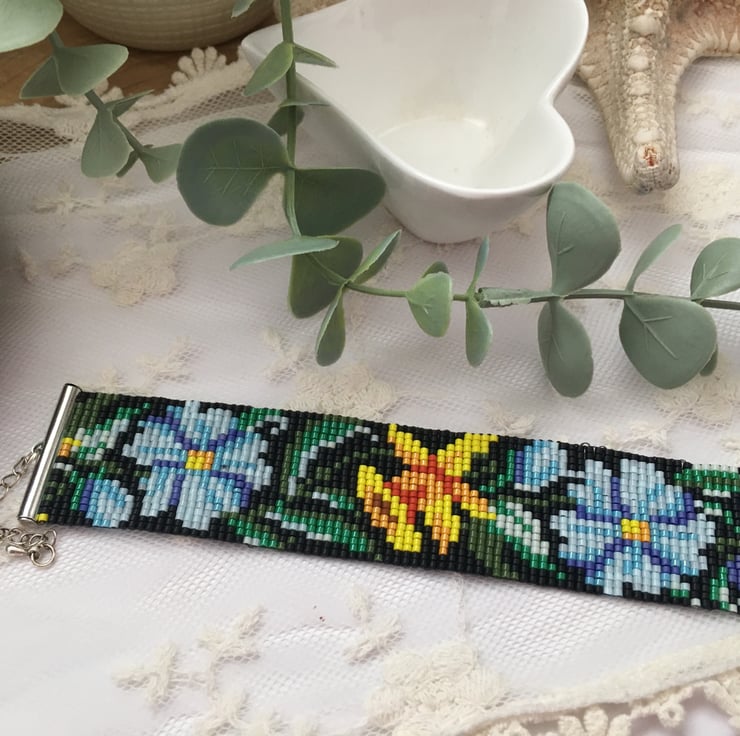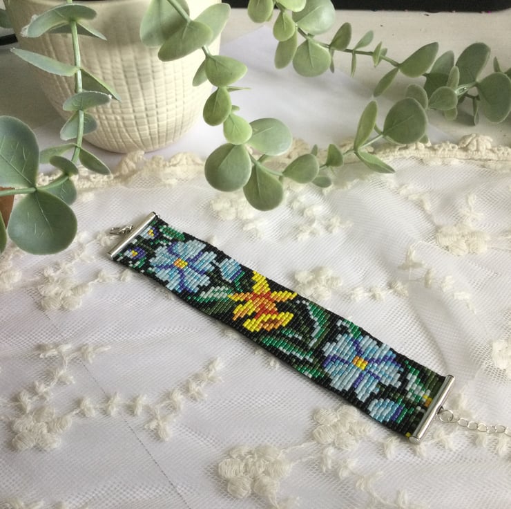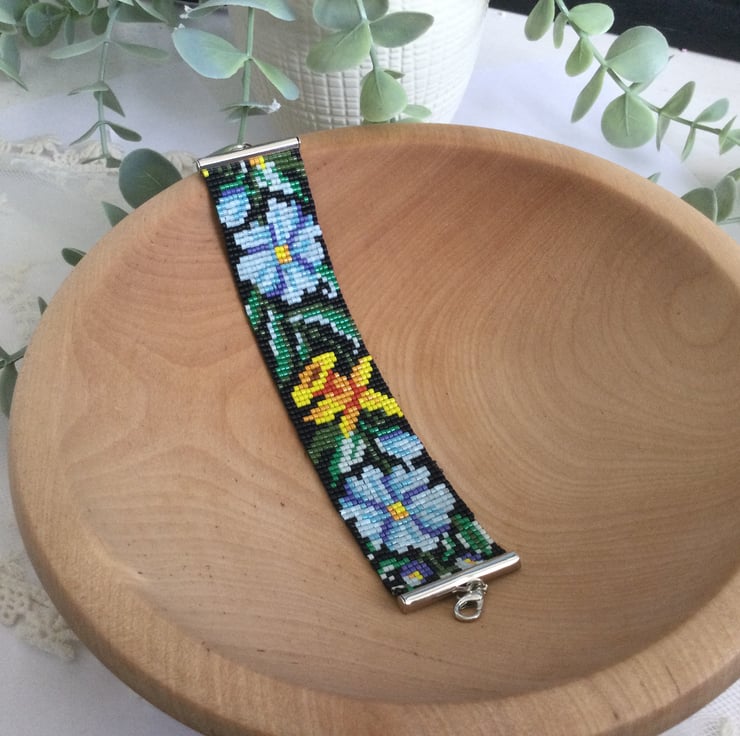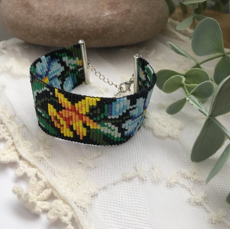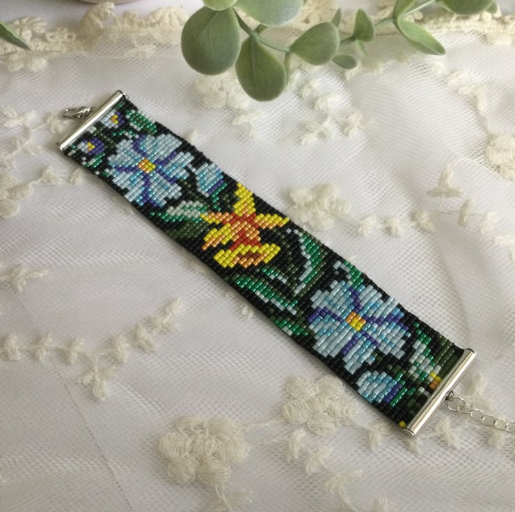 The vibrant Spring floral design is designed by me and created on a beading loom using tiny Delica seed beads which are renowned for there quality and uniformity . Delicate and light weight with an extension chain to allow the perfect fir for most wrist sizes.