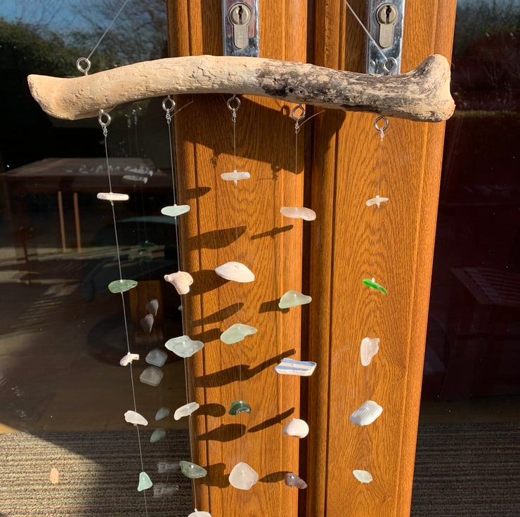 The piece of driftwood is approx 33cm in length. It was bleached when collected in order to fully clean the wood. The longest strand is approx 40 cm. The pieces of glass, pottery and shell have been drilled and then knotted onto fishing line.
