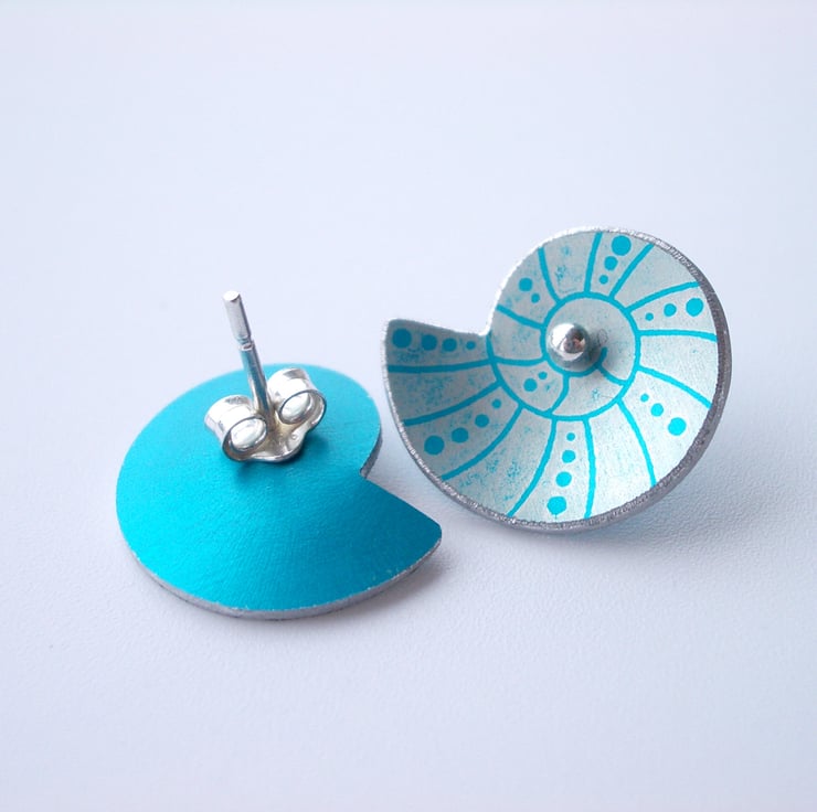 These shell studs are made from aluminium which I have dyed turquoise and printed with a shell design. The dye is made permanent by sealing through heat and becomes part of the metal. I saw out the shell shapes by hand using a jeweller’s saw and dome them inwards so that they catch the light when worn.