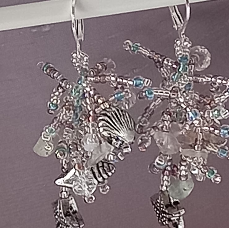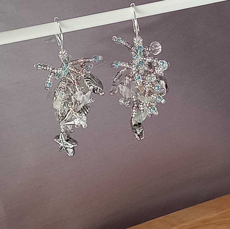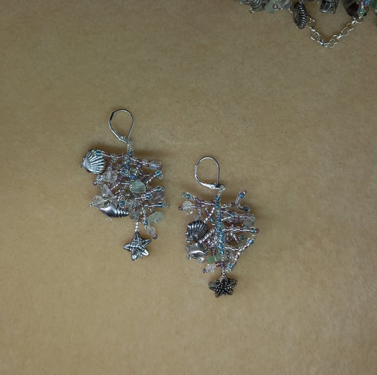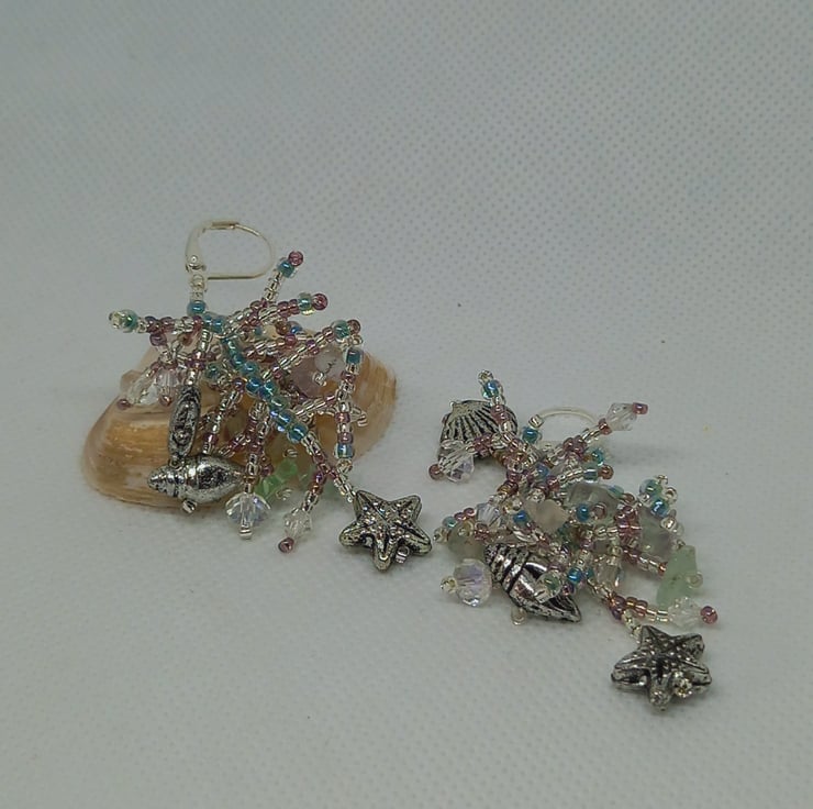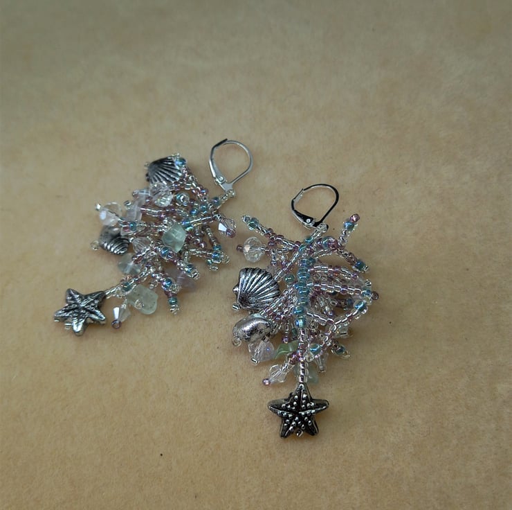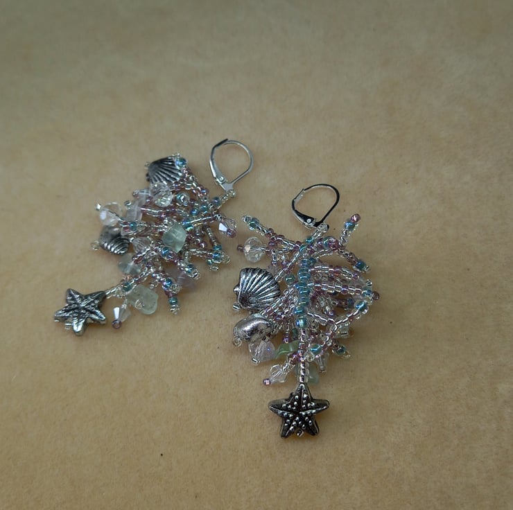 These earrings are entirely hand beaded with miyuki seed beads to create a coral effect. Interwoven are pretty fluorite chips, sea-themed charms, crystal bicones and small crystal rondelles. These are lightweight earrings and are securely attached to silver plated loopback ear hooks.