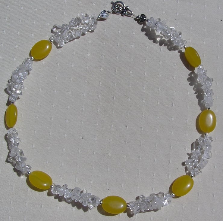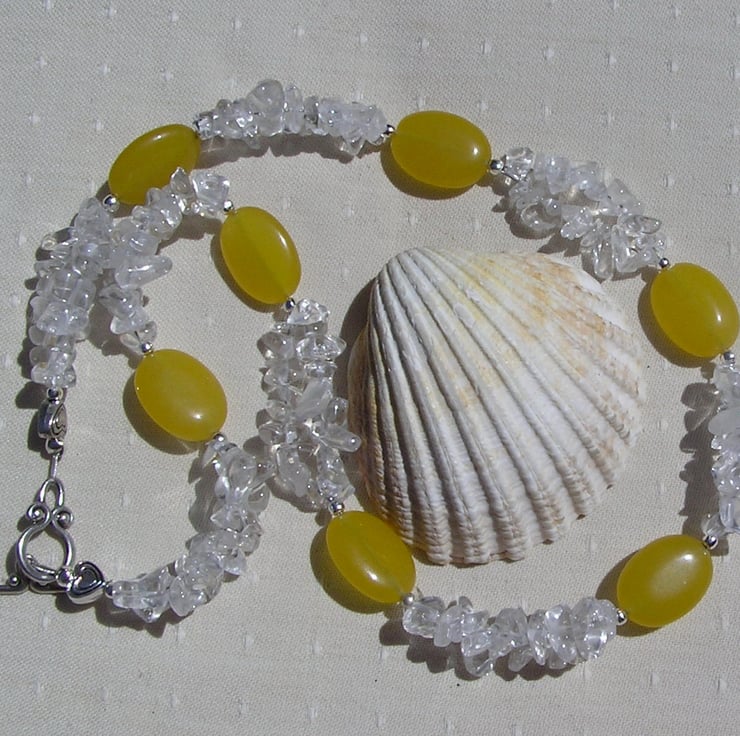This Stunning Necklace is made from Bright Yellow Jade Chunky Oval Beads each separated by double stranded Clear Quartz Gem Chips- An Cheerful Bright combination that will look stunning either worn casually or with something more Elegant for a Special Evening out