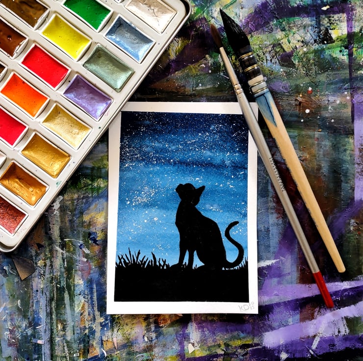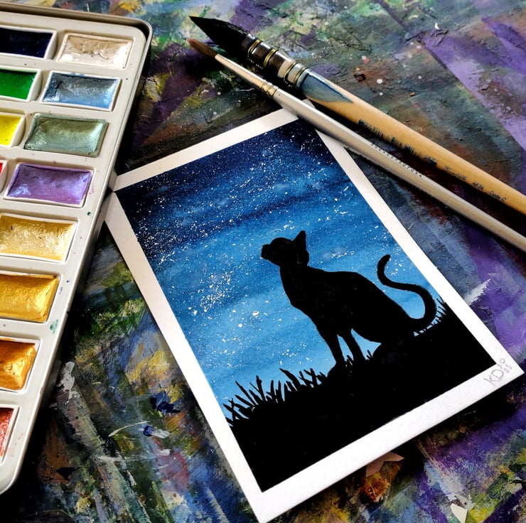 Some whimsical watercolour art of a black silhouette of a cat sitting down on the grass under the dark blue night sky, looking up at the stars and stargazing.