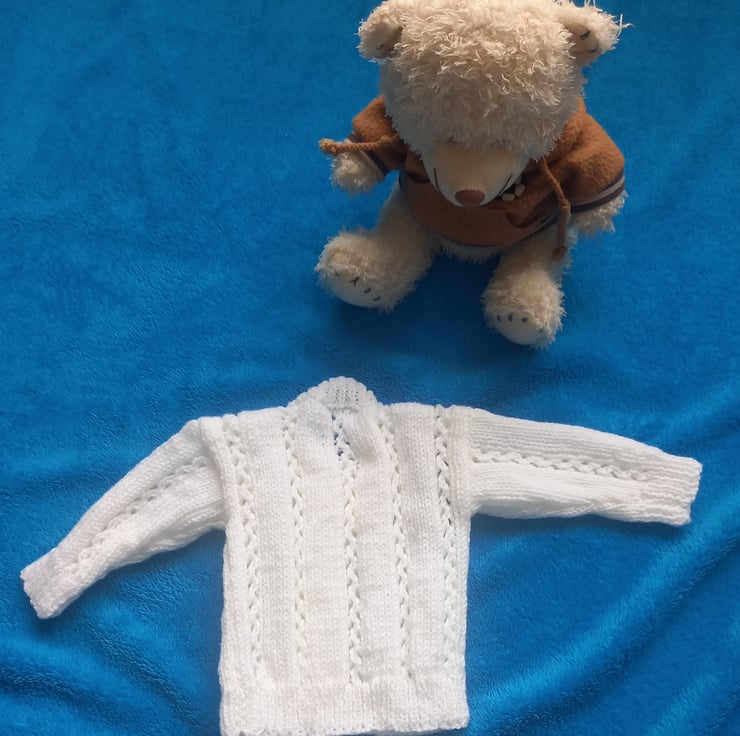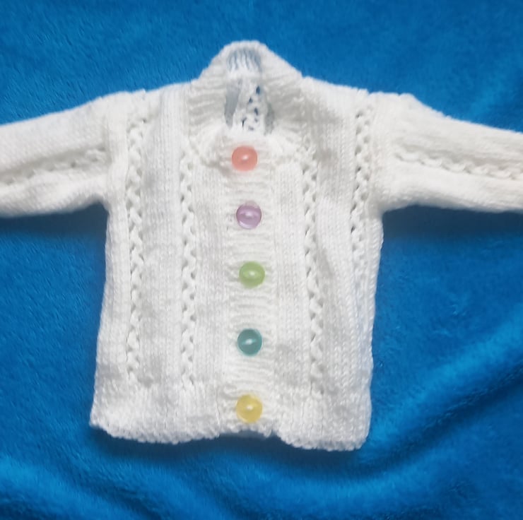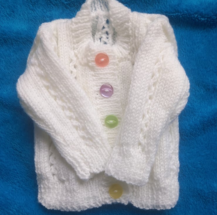Pretty white baby girls cardigan with lace panels and sleeves, hand knitted in a practical machine washable yarn, with 5 different colour buttons.