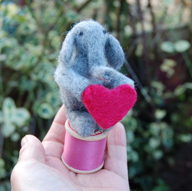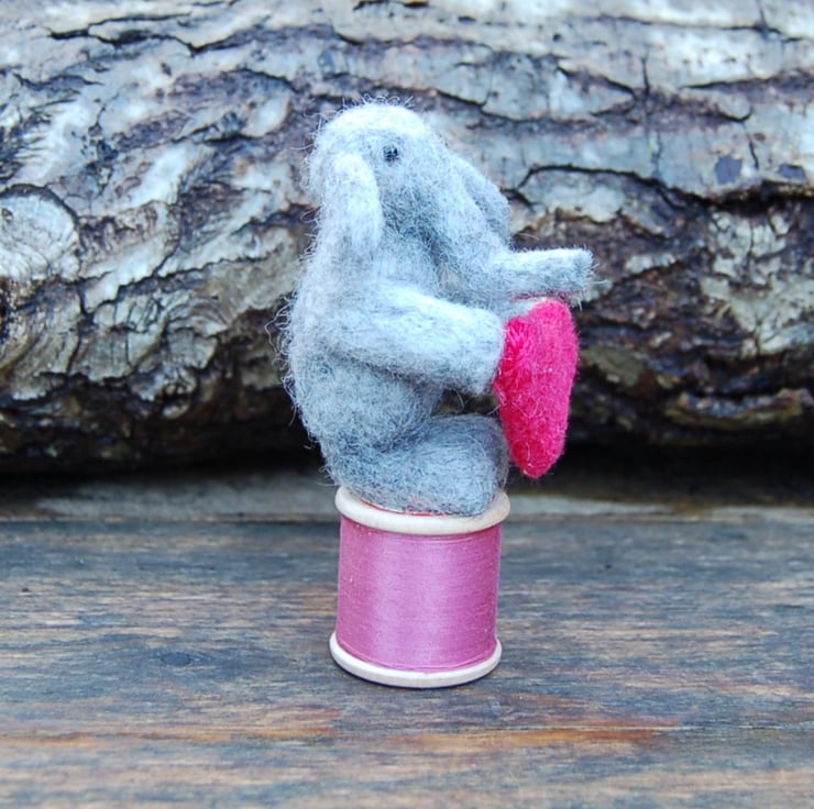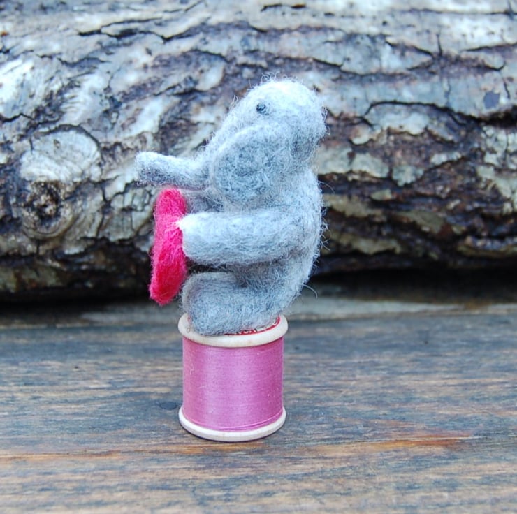 Cute grey elephant made from wool fibres, needle felted into shape. .It is holding a red heart.