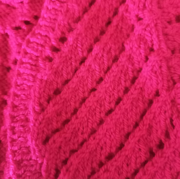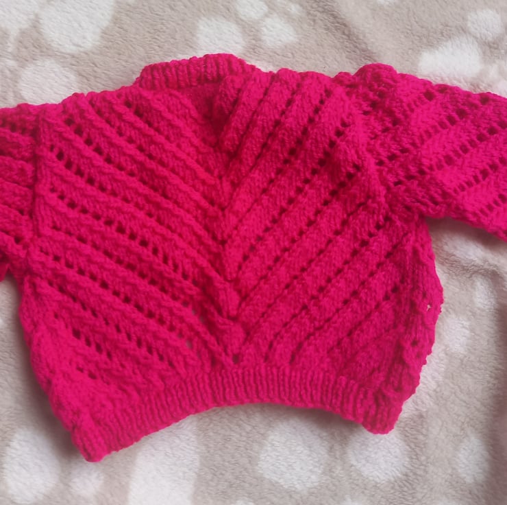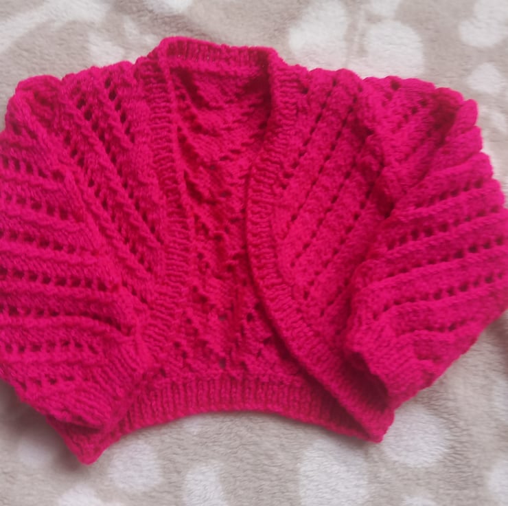 Hand Knitted baby girls bolero Knitted in a vibrant pink machine washable yarn, in an all over lacy pattern.