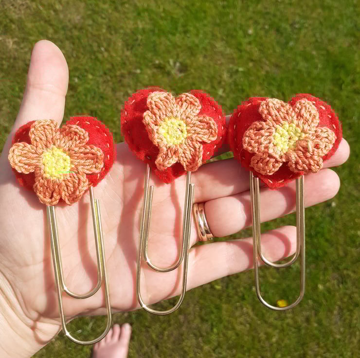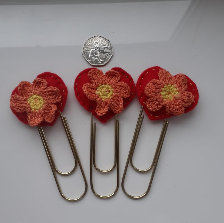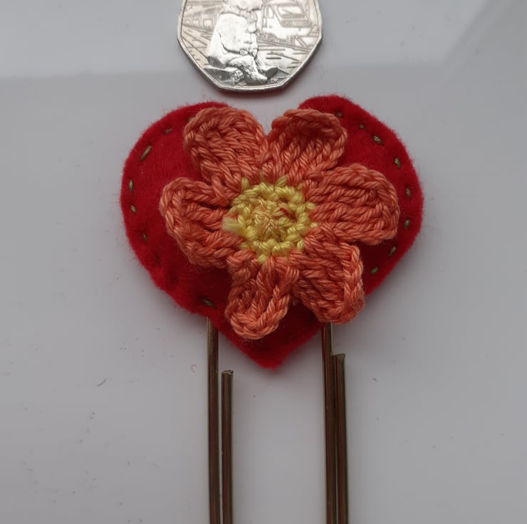 this is a large paperclip style bookmark with a felt heart and crocheted flower decoration.