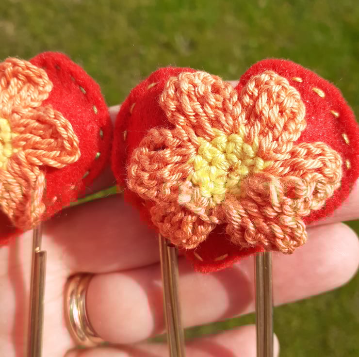 The hand-sewn and hand cut red heart has been attached securely to the jumbo size gold coloured metal paperclip. An orange and yellow crocheted flower has then been sewn on to the heart.