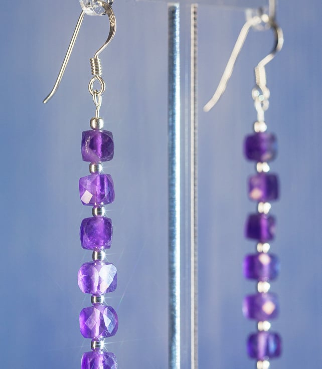 Faceted cubes just look so gorgeous when made into drop earrings. Faceted cuts reflect the light. These are a lovely rich purple.