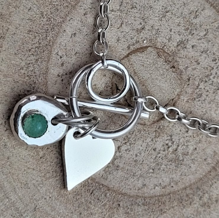 The two charms have been attached to the toggle closure a chunky heart and a pebble that has been set with a 5mm Green Adventurine. The pebble was created by melting silver into a pebble shaped mould, slightly flattened, filed and sanded until smooth on the top for the setting to be attached. I have filed the base but it is still slightly textured from the melting process. I have left the heart charm plain however this could easily have an initial stamped onto it making this a extra special personnalised gift. Contact me if you would like this option