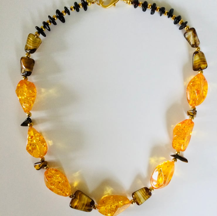 Tiger’s eye was traditionally believed to enhance creativity, boost energy and promote spiritual healing and self confidence. Amber was also believed to promote self confidence and self expression and to absorb negative and stagnant energy. Like all my pieces of jewellery, this is truly unique.