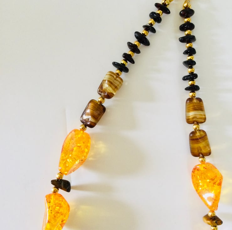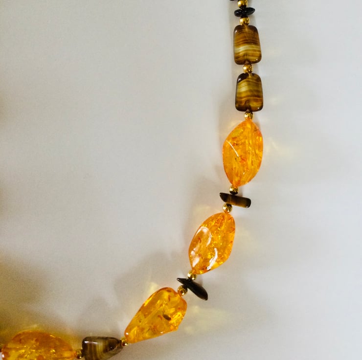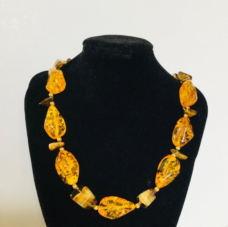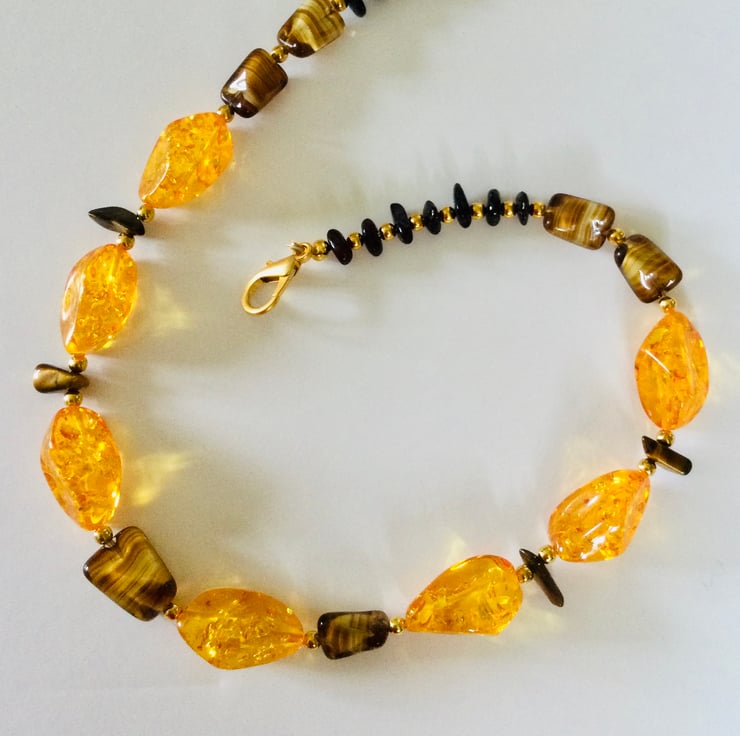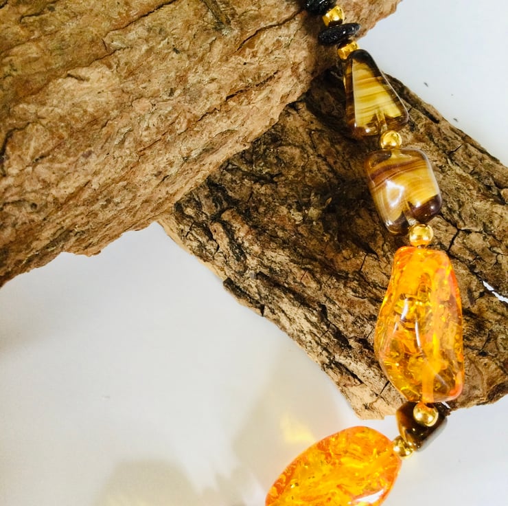 Tiger’s eye was traditionally believed to enhance creativity, boost energy and promote spiritual healing and self confidence. Amber was also believed to promote self confidence and self expression and to absorb negative and stagnant energy. Like all my pieces of jewellery, this is truly unique.