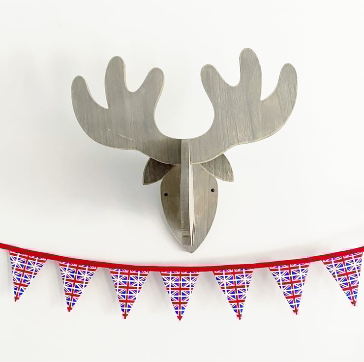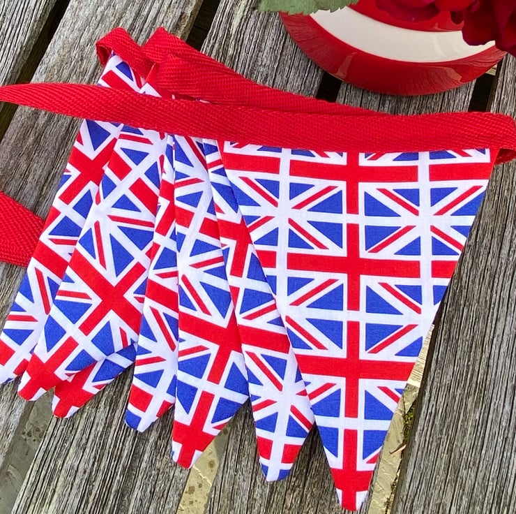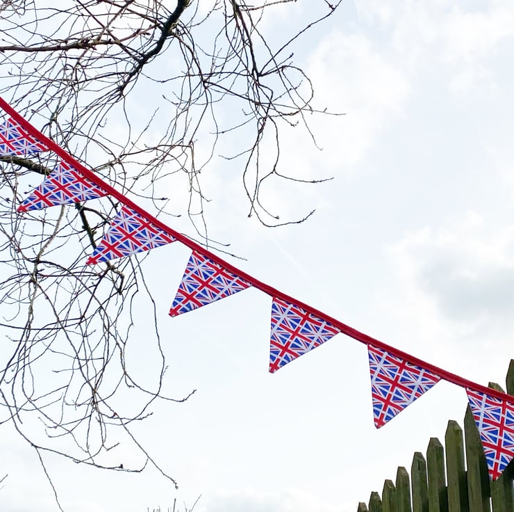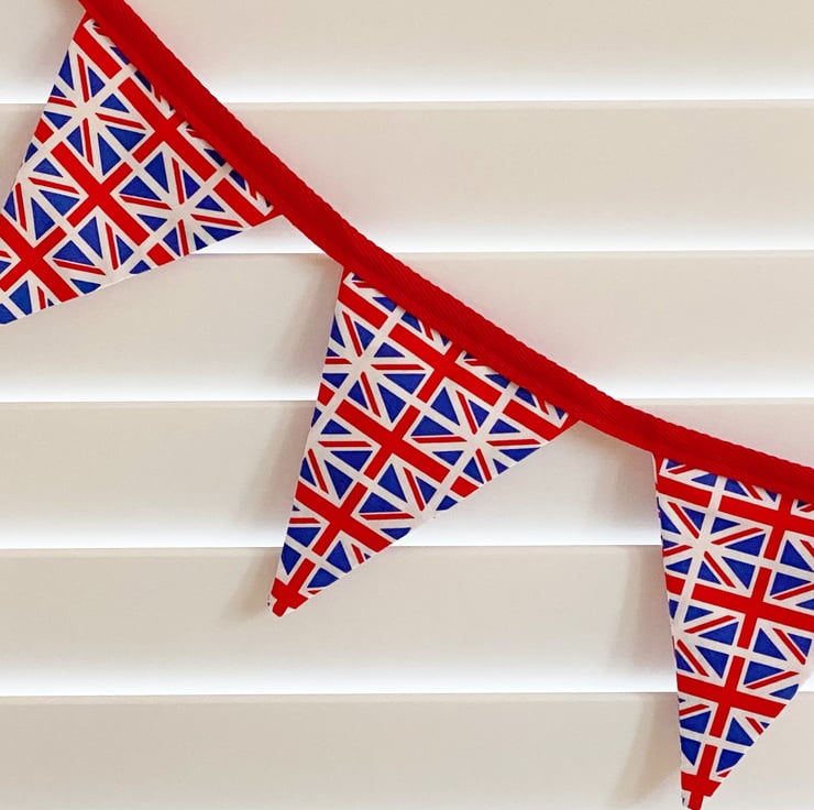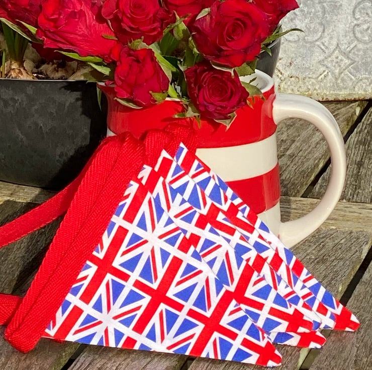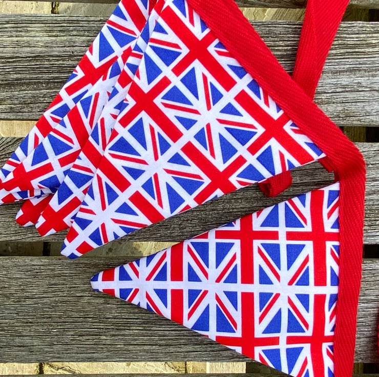 Handmade patriotic red, white and blue Union Jack bunting. Perfect to celebrate the coronation of King Charles.