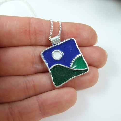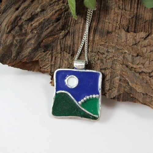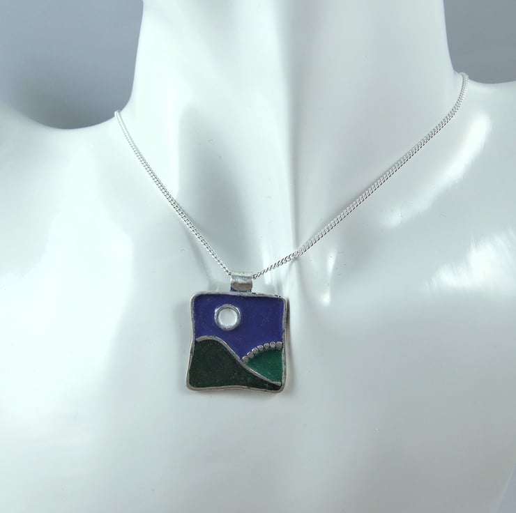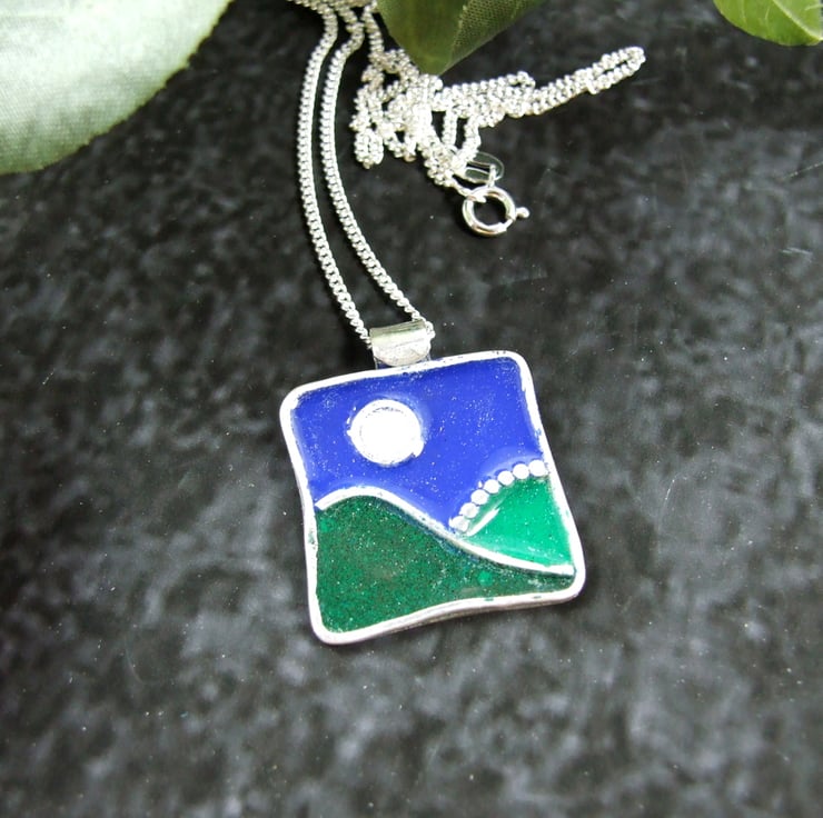 The necklace is entirely handmade in a freeform abstract landscape design with hills and moon. The scene has been created with silver sheet for the base and silver wire for the outlines and Efcolour low fire enamels for the colours.