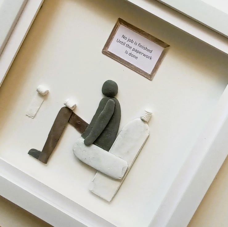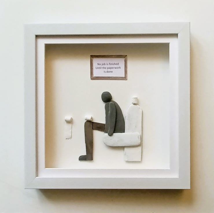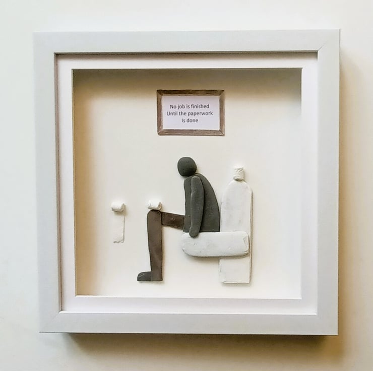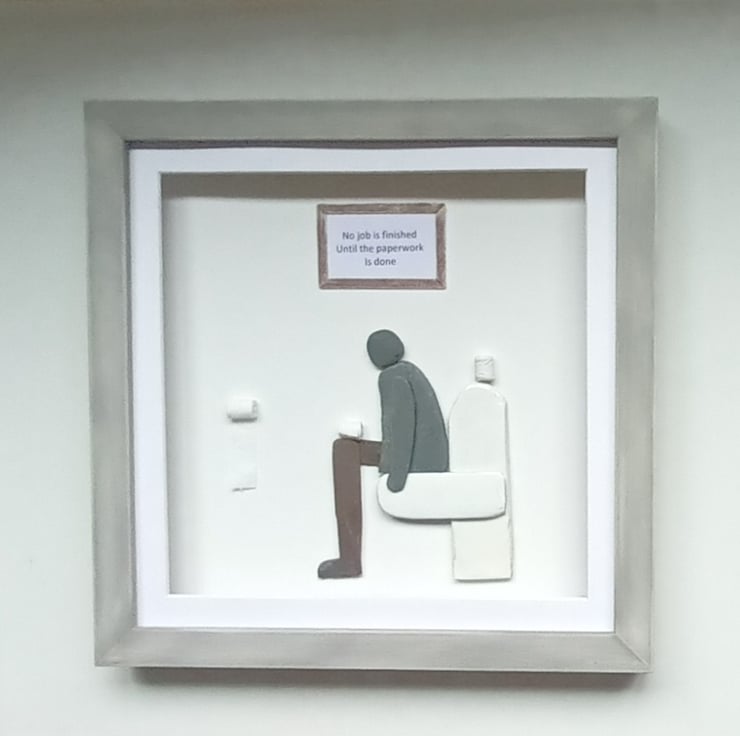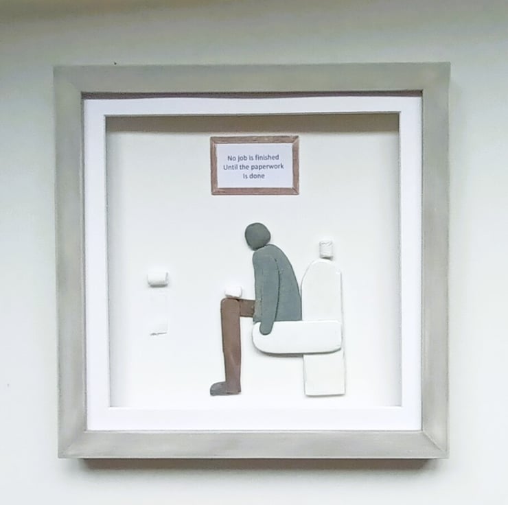A stone man sitting on the loo beneath a sign that reads 'No job is finished until the paperwork is done' set inside a 29cm glass fronted frame.