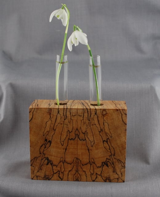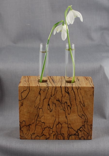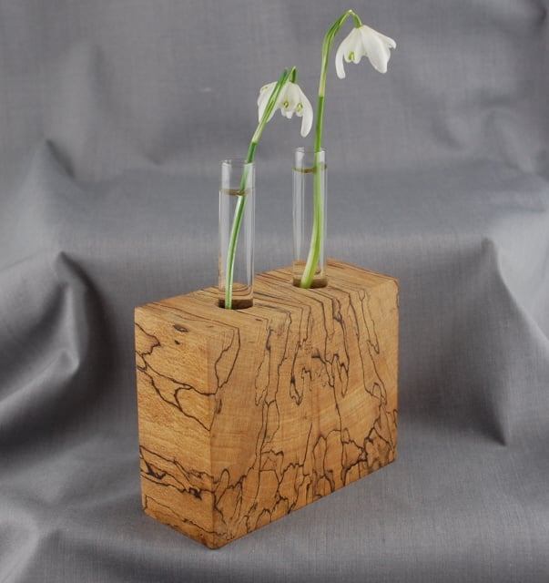 Ideal size for displaying those delicate early spring flowers, this handmade bud vase comes complete with 2 glass inserts, each needing only to be filled with water before adding your chosen flowers. The unique black lines are completely natural. This spalted beech bud vase measures approximately 12.5 cm high (with the inserts) and 10 X 4 cm wide.