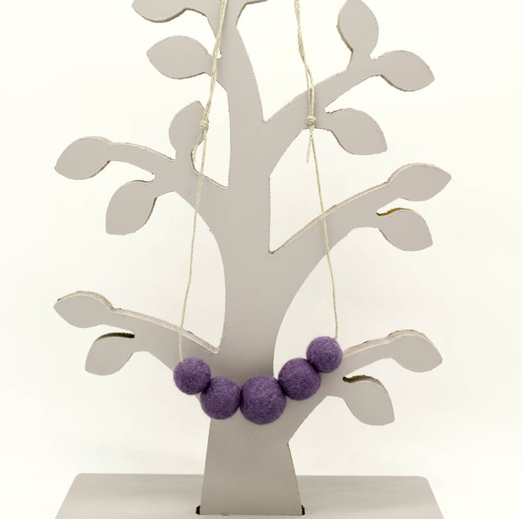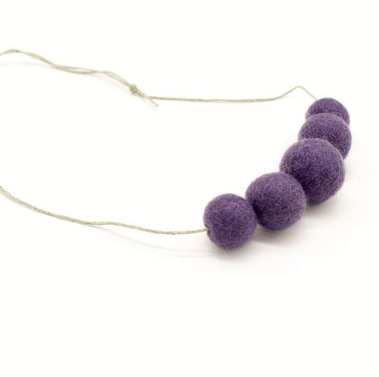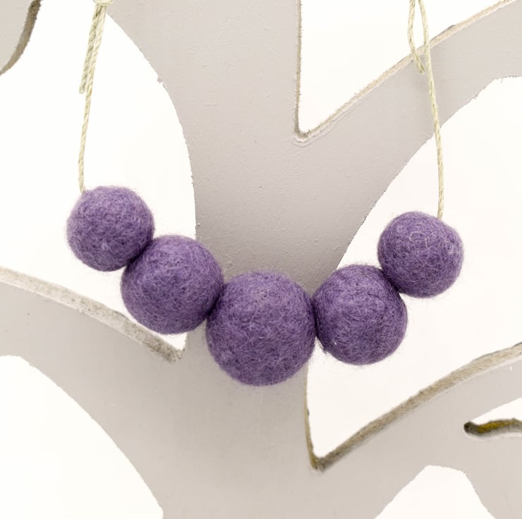 This statement necklace has been created using five felted beads made from lavender merino wool and strung on light grey 1mm hemp cord.