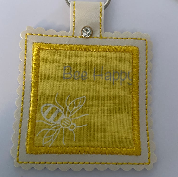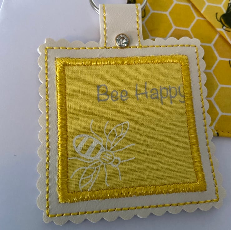 Also comes with a pretty matching Bee Happy keyring. Stitched onto faux leather, with a vinyl back and crystal kam snap fastener with a metal ring.