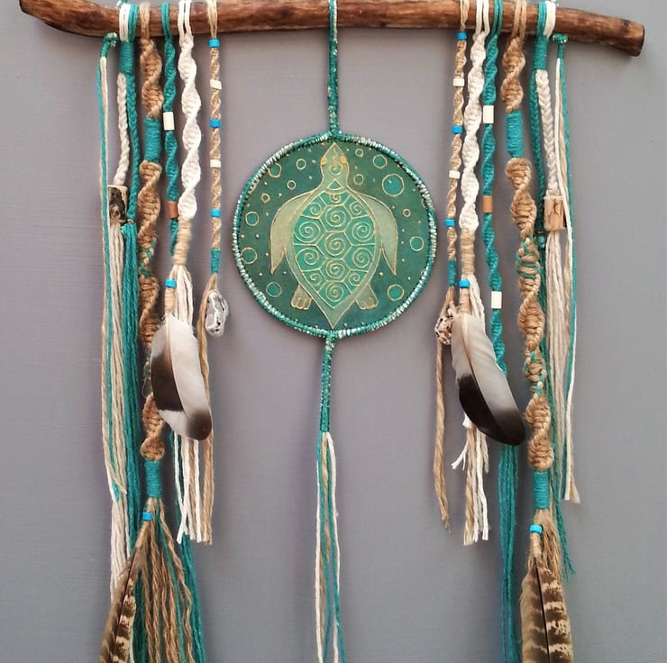 This 12cm diameter Turtle design totem wallhanging is hand printed then painted with macramé, driftwood, stones and beads. It measures 60cm long in total from the hanging loop to the end of the tendrils. The driftwood header is 36cm wide. Stiffened to hold it's shape. Plain black on reverse. I made this one with my sister Mandy at Thrifty Drifter, she does the macramé and adds the driftwood and beads. I do the sewing, stitching and the central design.