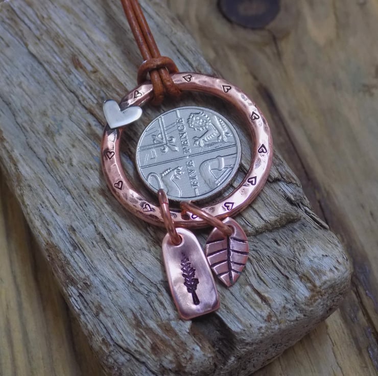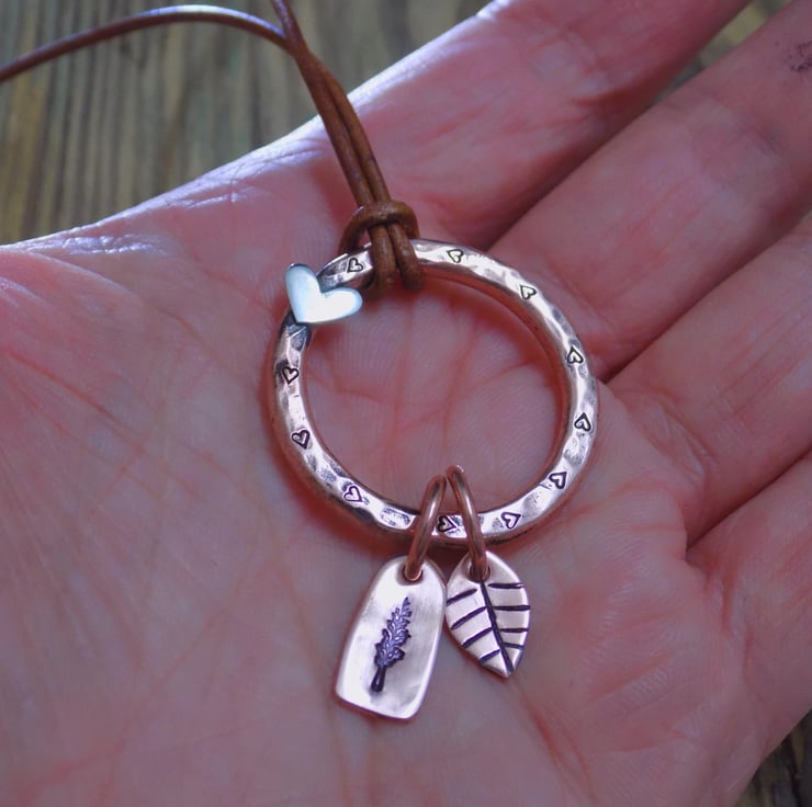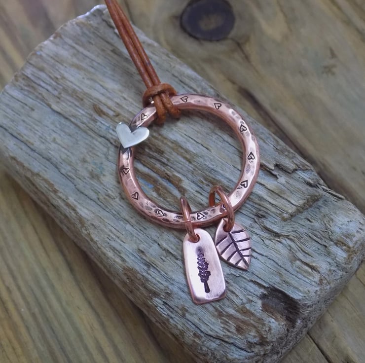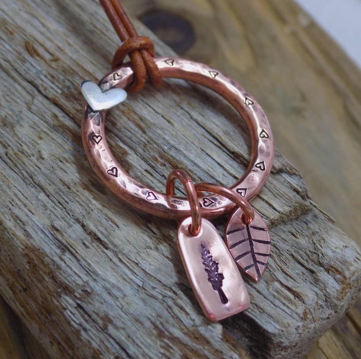 Made from thick 3mm copper wire and formed into an organic circle. Tiny hearts have been added around the circle, with an additional sterling silver heart soldered on as well. Hand made tree and leaf charms have been added to the hoop for some movement. Simply threaded on to an adjustable antique brown leather necklace - 16-18" in length.