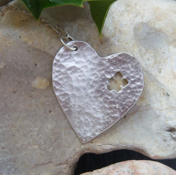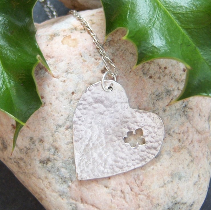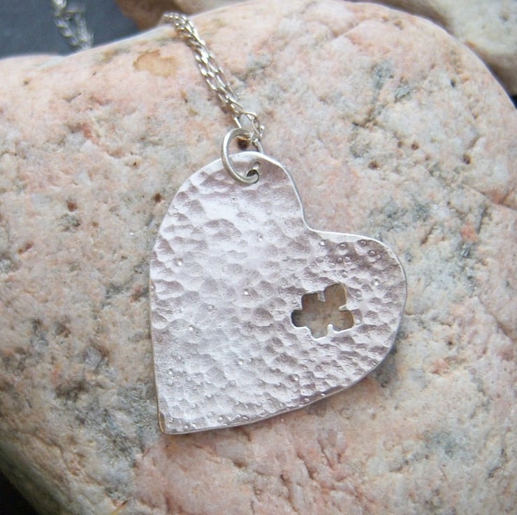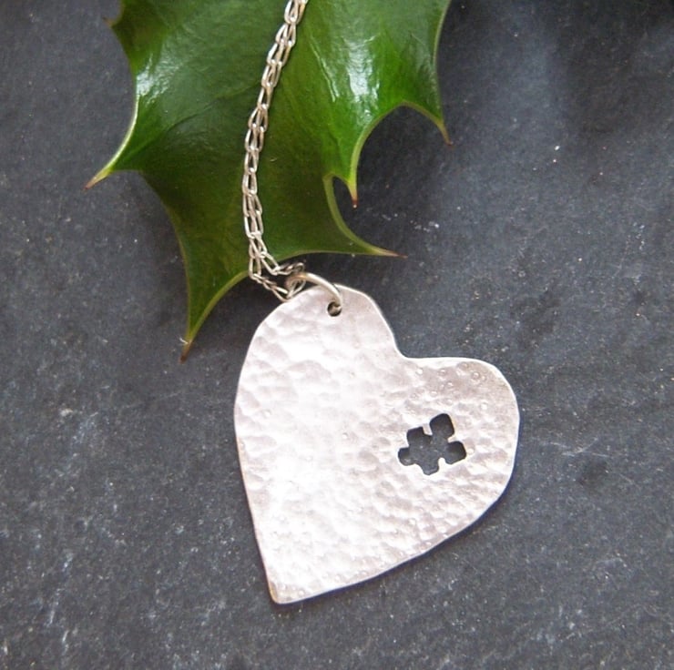 A heart cut from sterling silver sheet and textured on the front. A jigsaw piece is cut into it. Approximately 3cms long.
