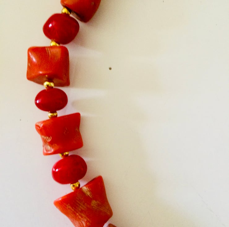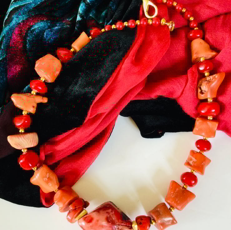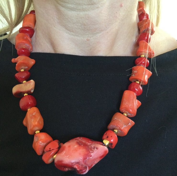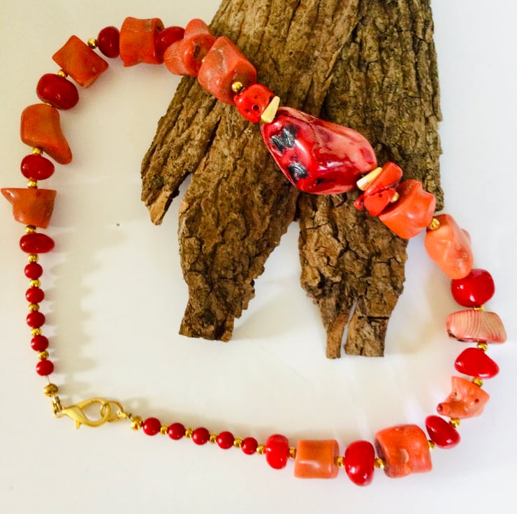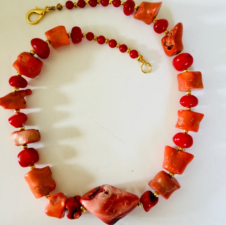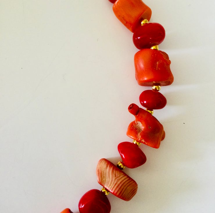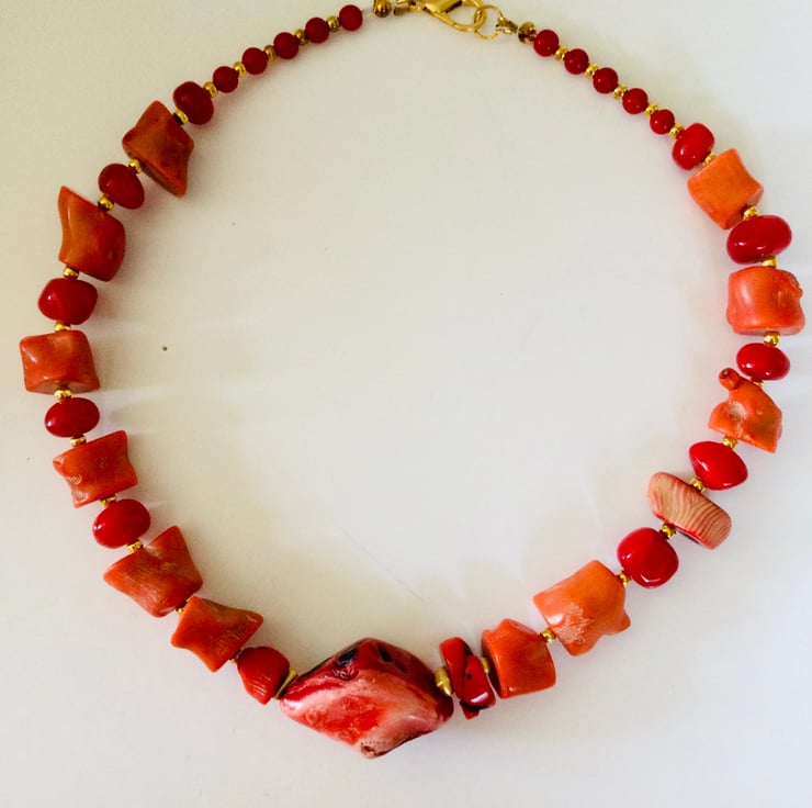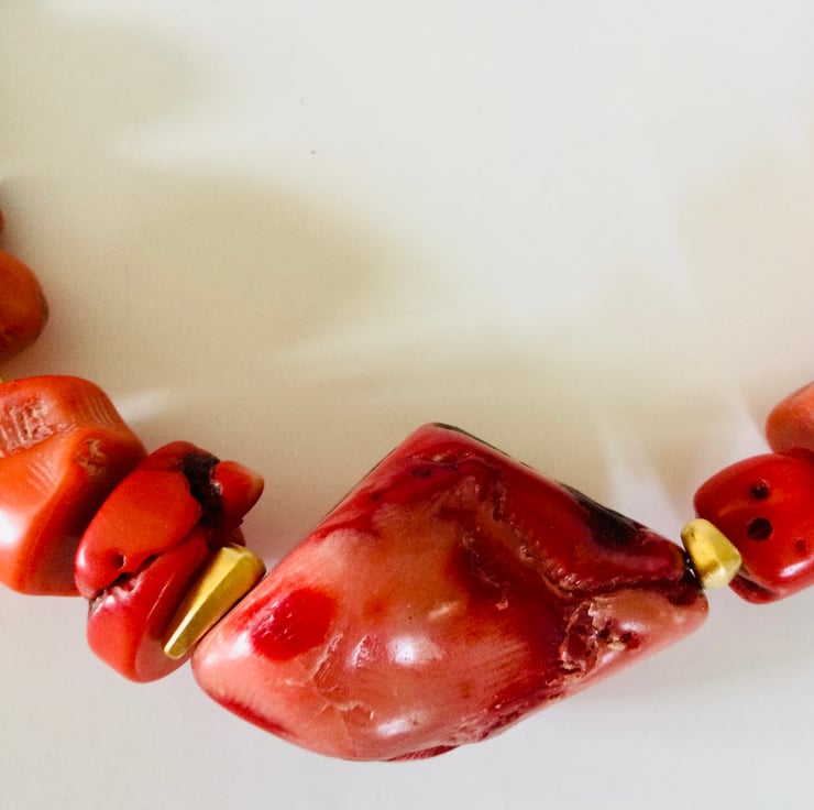 This stunning coral necklace features a large bamboo (deep sea) coral nugget measuring 5 x 3 cm and irregular chunks of bamboo coral alternating with toning red glass beads and gold plated spacer beads.