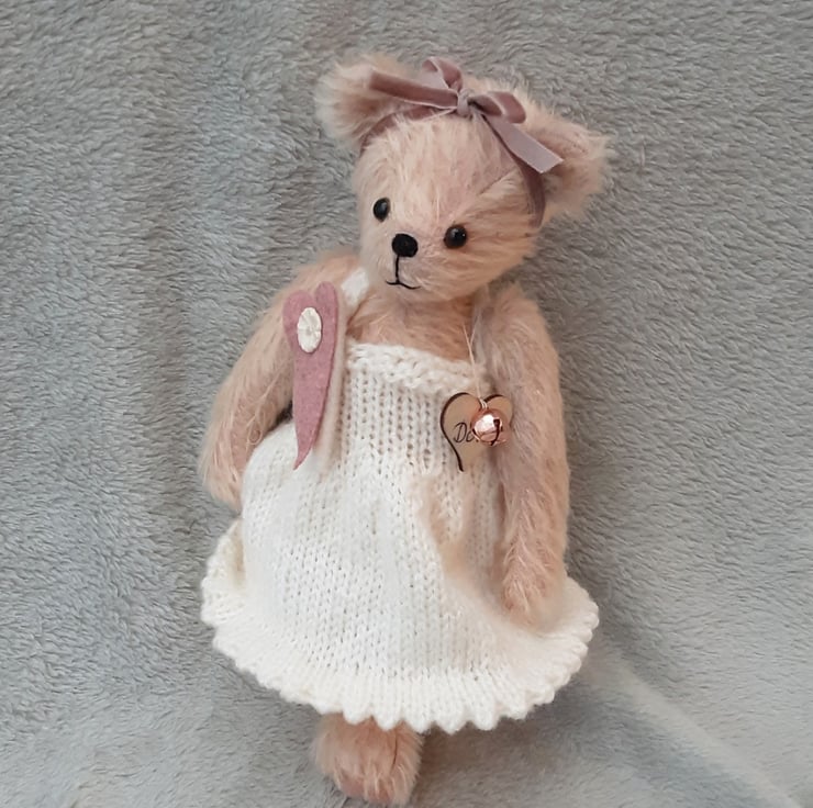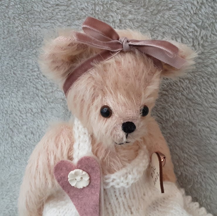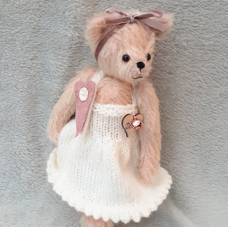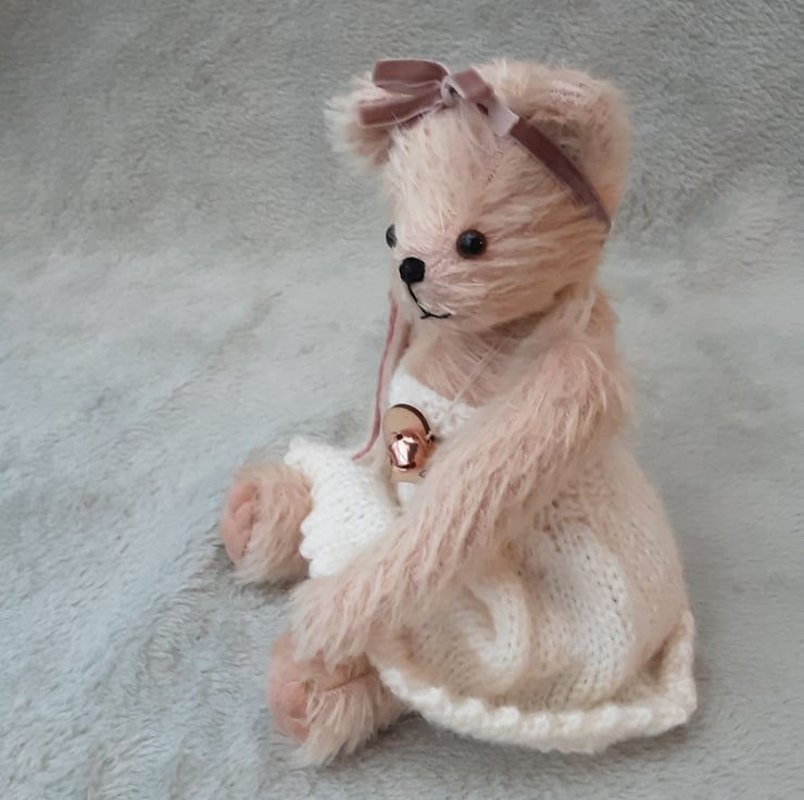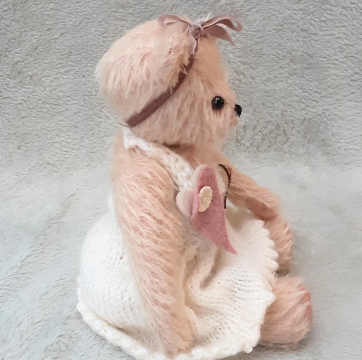 A graceful little bear who likes to look pretty wearing her hand knitted ivory cream dress with scalloped hem, finished with a wool felt heart and button brooch and wearing a dusky pink velvet bow to her head.