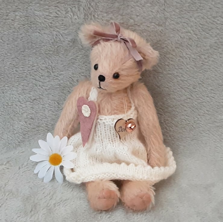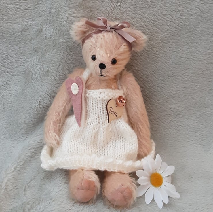 Meet Dora, a lovely traditional style bear, standing at approx 10.5"" tall and handmade from 12mm semi sparse Helmbold mohair in French pink, a peachy coloured fur on a pale pink backing.