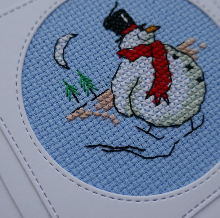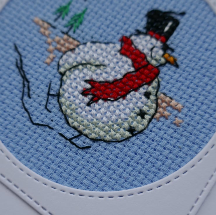 The cross stitch Skating Snowman is from a design by Mouseloft. The snowman is stitched in white and pale grey with a red scarf, black hat and an orange carrot nose. He has been stitched onto blue fabric. The cross stitch has been mounted behind a white matt frame that has been cut with stitched square and circle dies before being layered onto another piece of white card to add extra dimension.