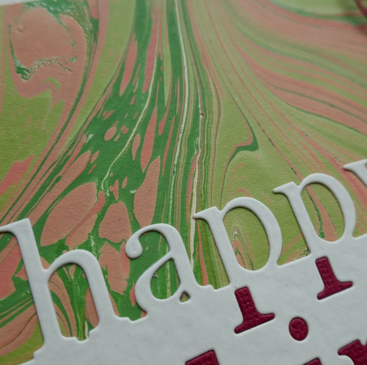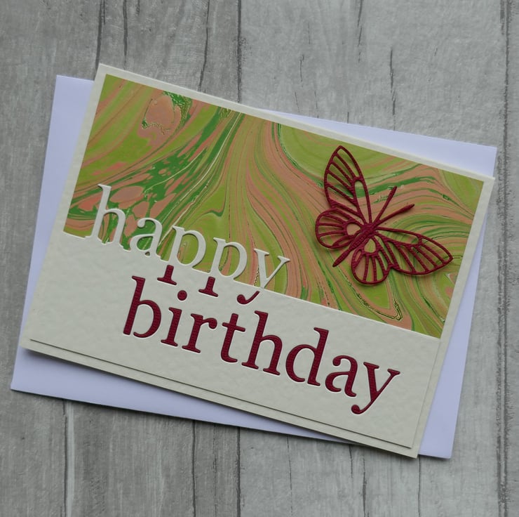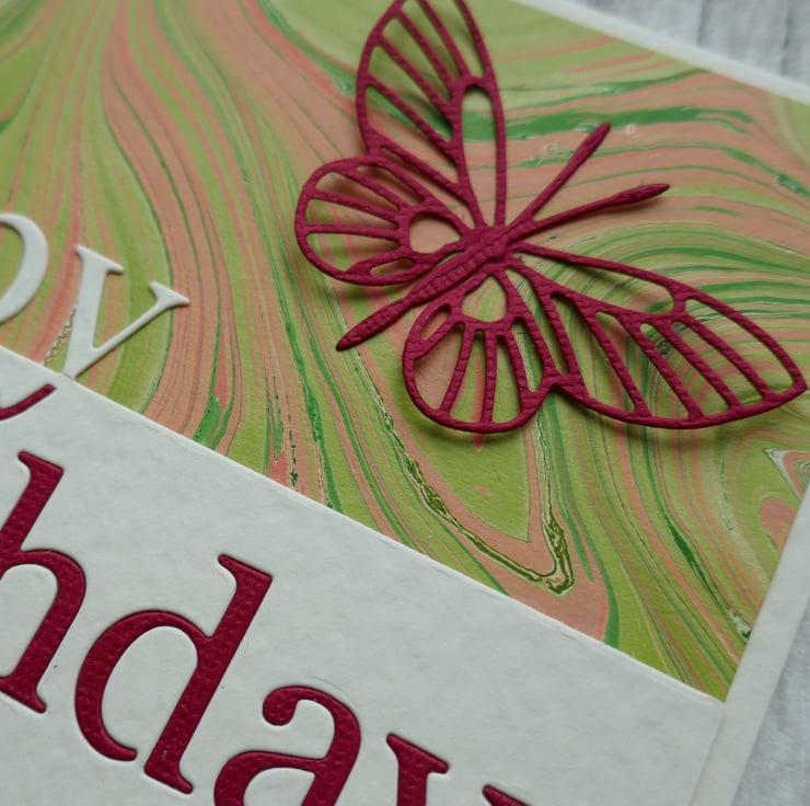 The front of the card is covered in a beautiful coral and green marbled paper from The Whimsical Marbler. The lower edge of the card has a die cut 'Happy Birthday' in cream hammer card with the lower section inlaid in dark red card. The card is finished with a red die cut butterfly which is attached along its body so the wings can be shaped.