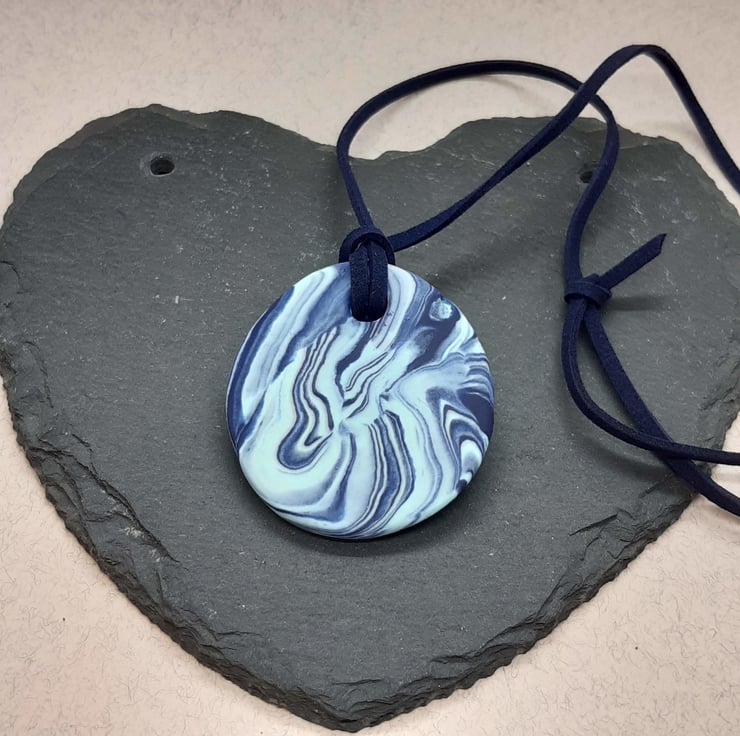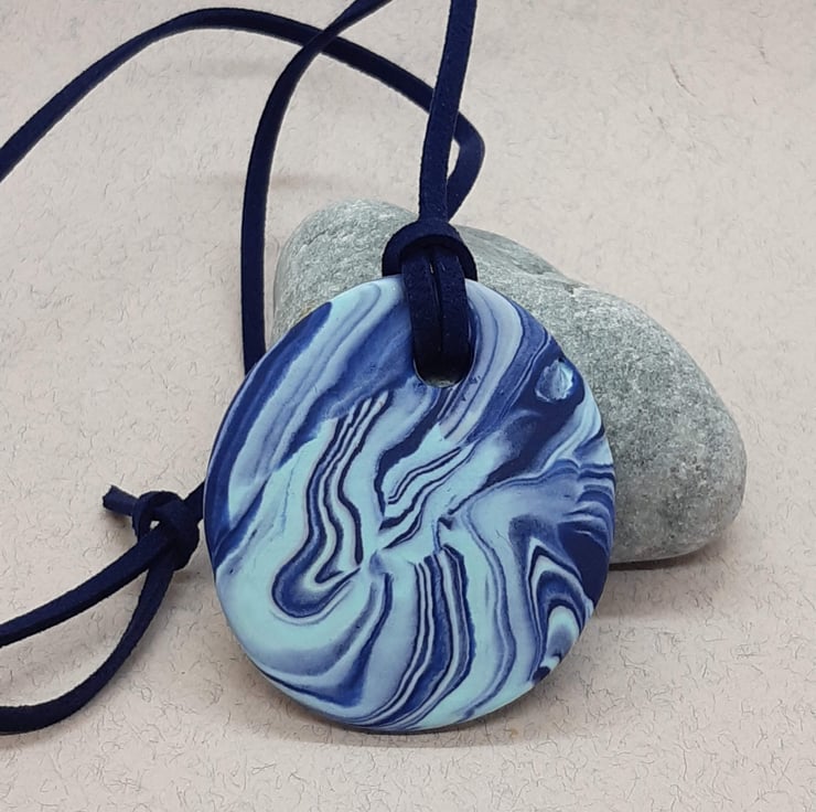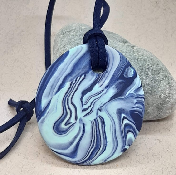 Round pendant handmade from a blend of navy, and sky blue polymer clay.