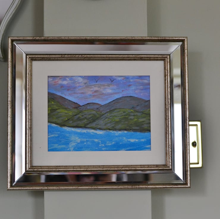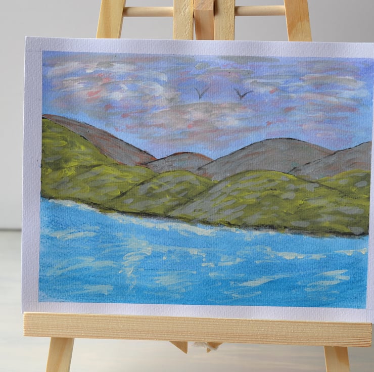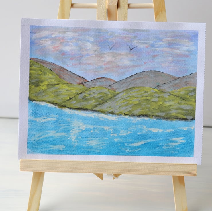 Hand painted sea view with hills behind. Painted on quality watercolour card. Painted using quality acrylic paints. Size of painting is 8" x 9" . The photo frame is not included I am just showing how it looks when framed. .Keep away from direct sunlight or it will fade overtime.