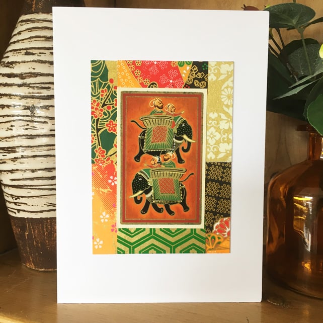 At the centre is a pretty vintage playing card featuring Indian elephants. I've used a selection of Japanese origami papers to frame it and the touches of metallic gold in these and the playing card adds a bit of sparkle.