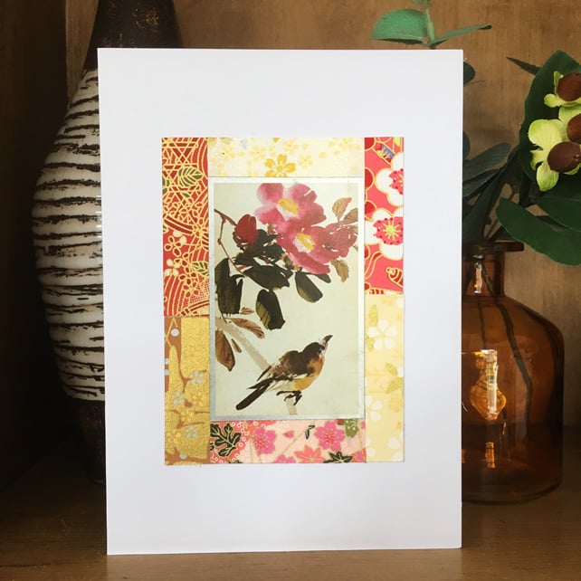 At the centre is a pretty vintage playing card featuring a finch and blossom. I've used a selection of Japanese origami papers to frame it and the touches of metallic gold in these and the playing card adds a bit of sparkle.