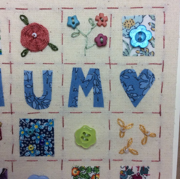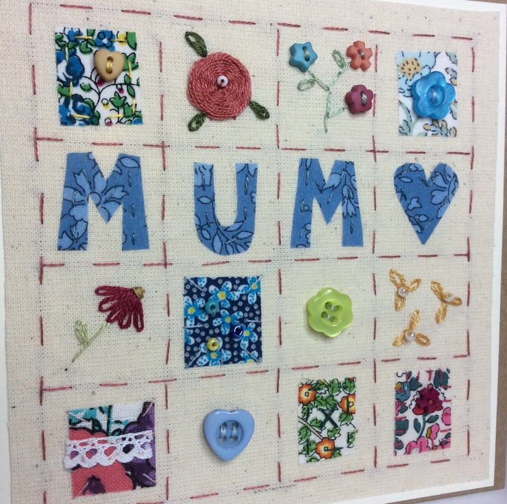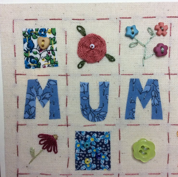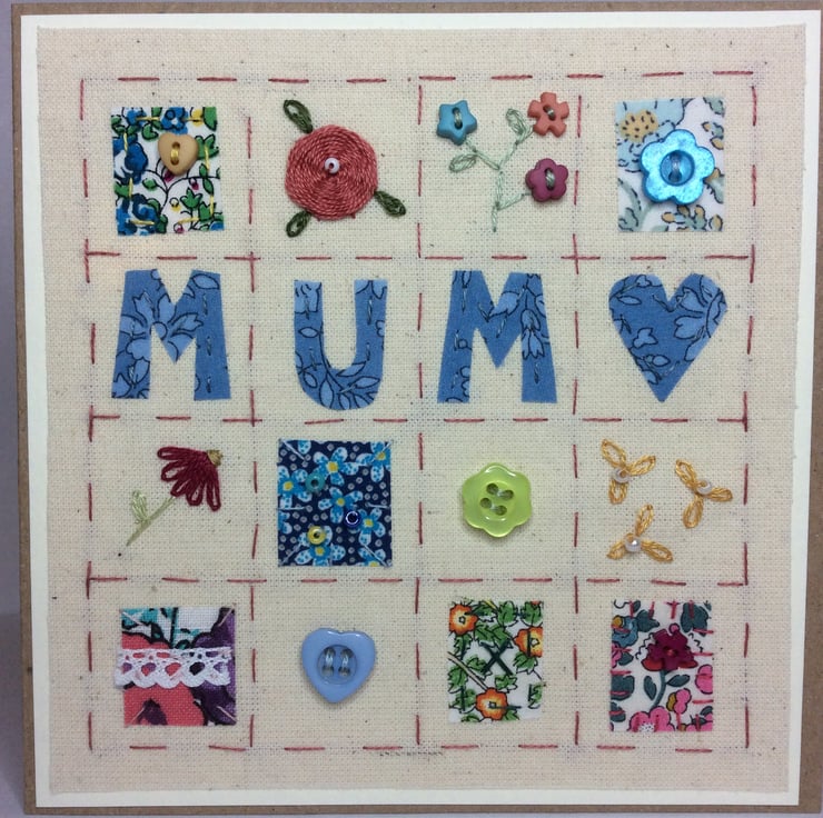 A beautifully made patchwork style card especially for your mother. It has been intricately hand-stitched which makes it a perfect, one of a kind keepsake card. The wording 'mum' is surrounded by pretty squares of fabric which have been stitched with buttons, beads and embroidery. It is perfect for a special birthday or Mother’s Day and could easily be framed for a lasting gift. It is made on calico and backed onto recycled kraft card with matching envelope and is left blank inside for your own message. It measures 12.5 x 12.5cm. All of my cards are carefully wrapped in cellophane and tissue paper and sent out within one day of purchase.