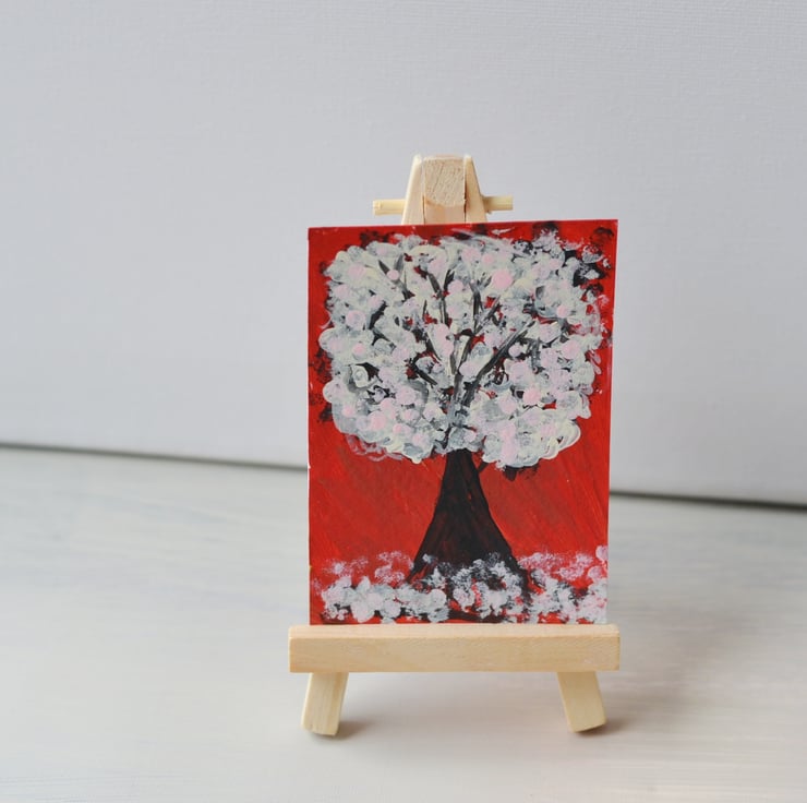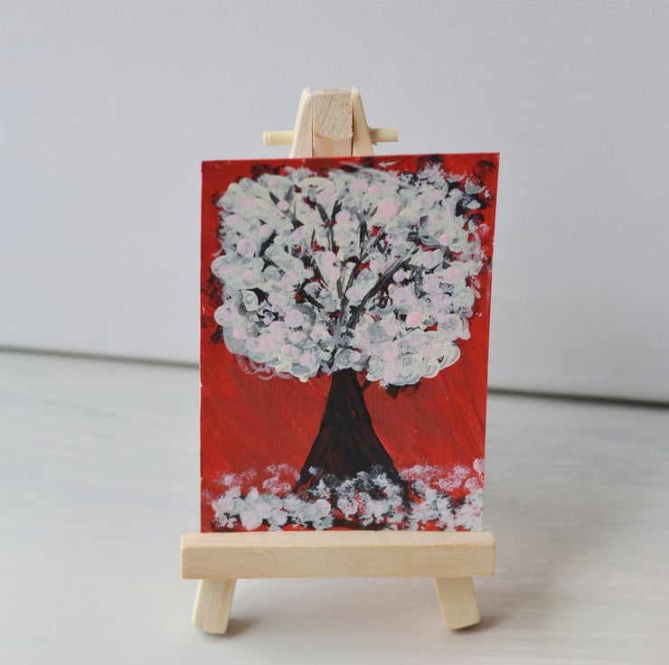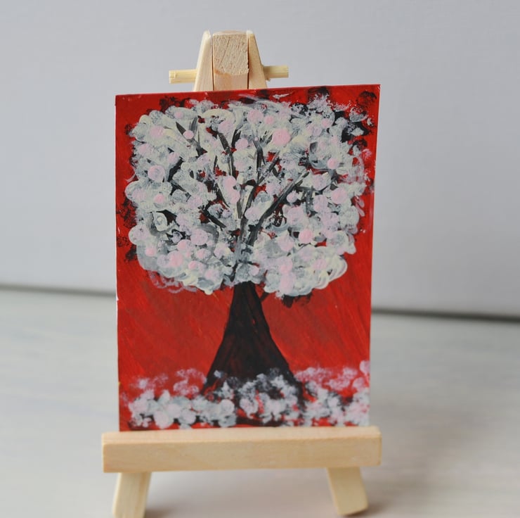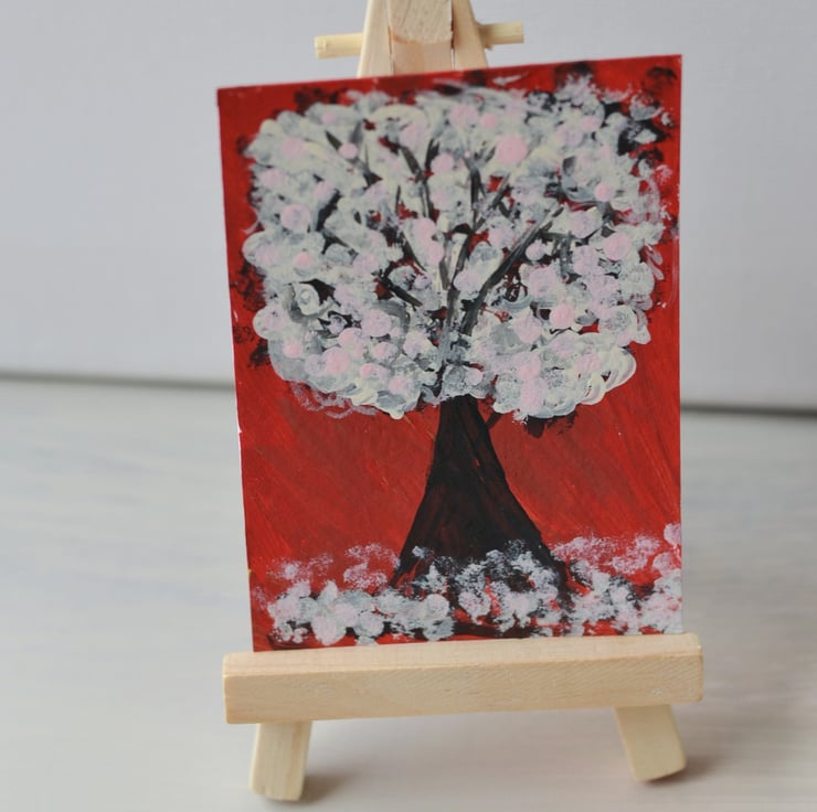 Aceo acrylic tree in blossom painting. Painted on quality acid free paper. Painted using quality acrylic paints. Size is 3.5" x 2.5" - Doesn't take as much wall space as a more traditional painting. Keep out of direct sunlight due to fading and away from water. I can put it into an ivory mount ifor £1.50.
