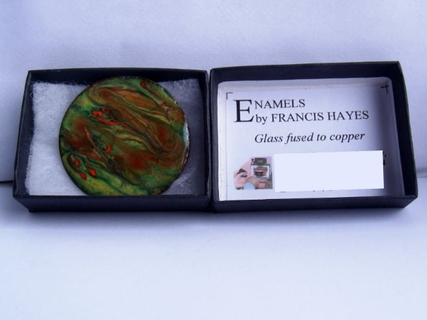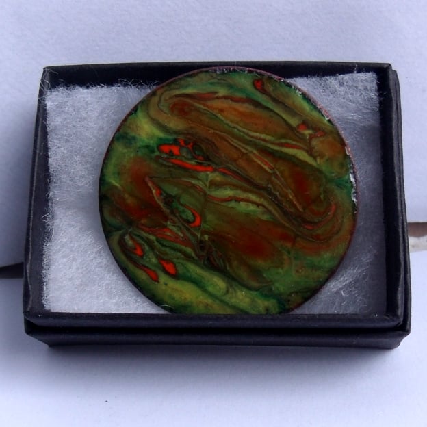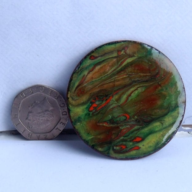 I have made the design on the brooch by drawing a point through enamel scattered over the green background, while the piece was red hot in the kiln. The resulting pattern is unique.