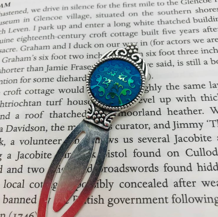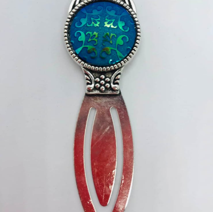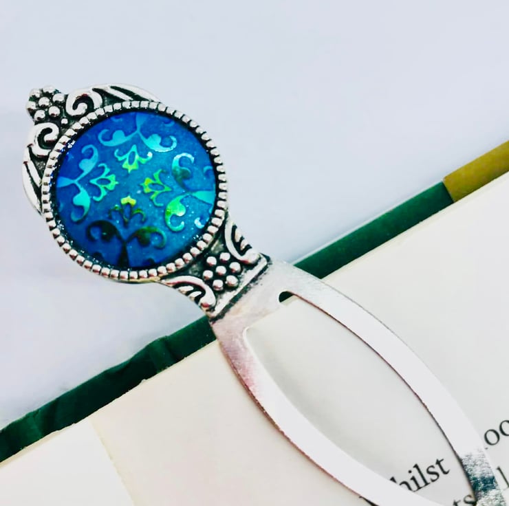 The prettiest shimmering blue iridescent bookmark. 8cm long, made from Tibetan silver. When held to the light the colour-changes are spectacular.