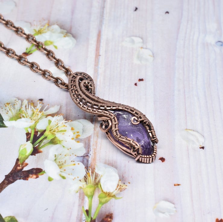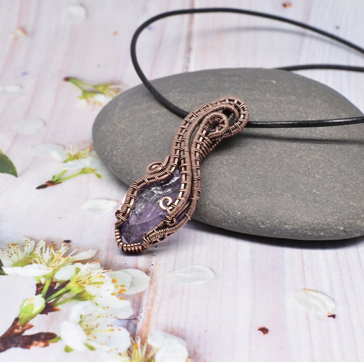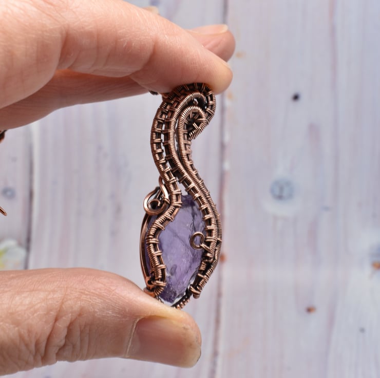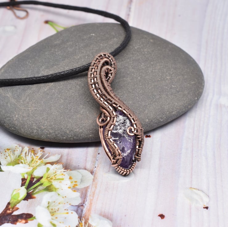 I have used solid copper wire to weave and wrap around this pretty rough amethyst to make this heady style unisex pendant.