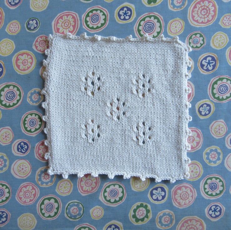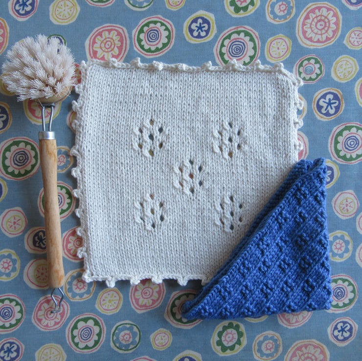 A pair of 100% cotton hand knitted dishcloths. One cloth is knitted in smooth stocking stitch with five eyelet daisy flower motifs in the centre and bound in a crochet picot edging in pale cream coloured cotton yarn. The other dishcloth is knitted in a basket weave stitch and bound in a cornish blue coloured cotton yarn. Perfect in the kitchen. Eco dishcloths can be washed on a 30' wash cycle and can be used repeatedly.