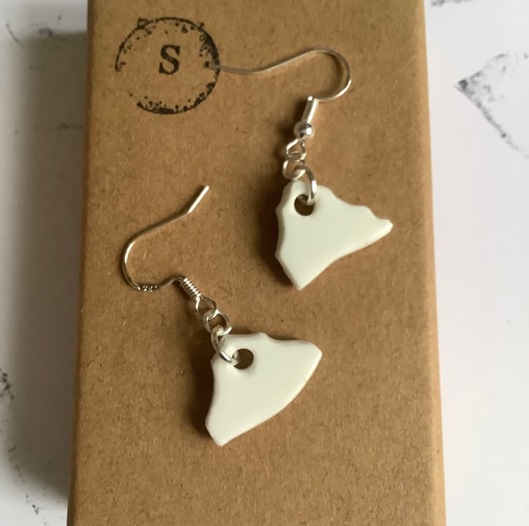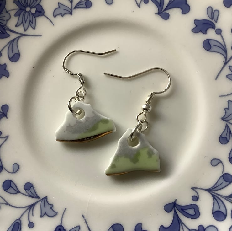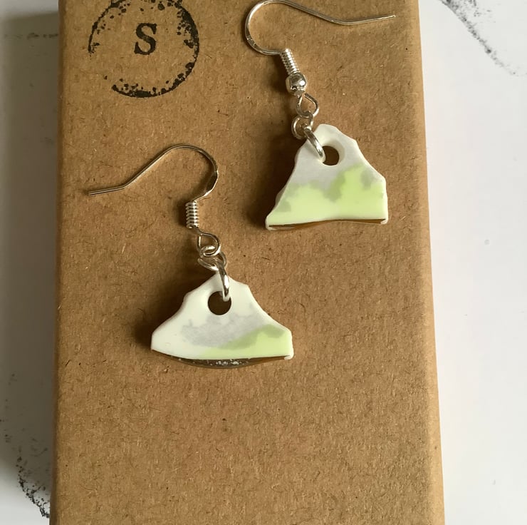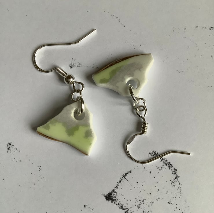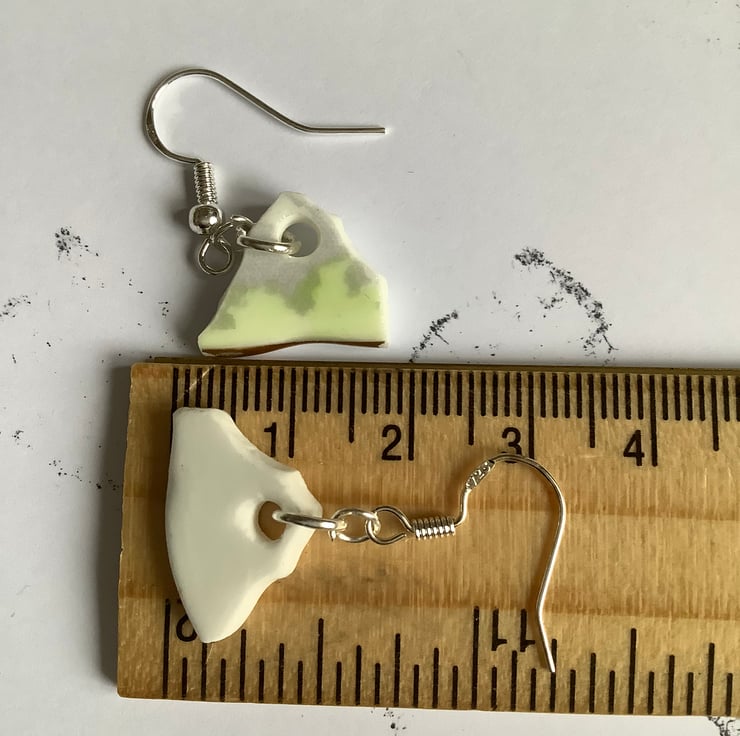 I gently clipped the plates and allowed shards to form and fall onto a cork board. I’ve sanded and sealed the edges, leaving slight tool marks and working with the shapes as they were originally formed. The subtle colours and slight fading really adds a different feel to these earrings. Similar in shape, design and size but completely individual. Full of history.