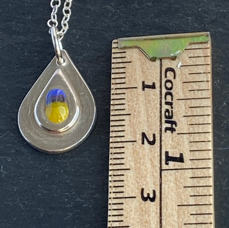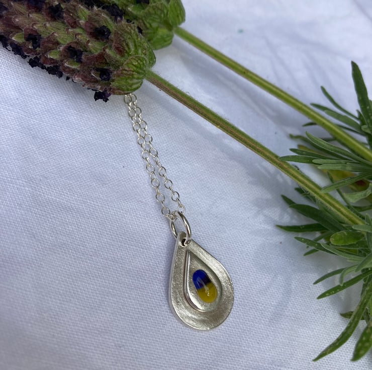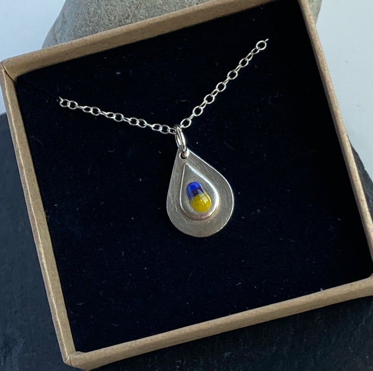 This fine silver pendant is made up of 2 layered teardrops with the smaller one inset with blue and yellow glass fused into the silver.