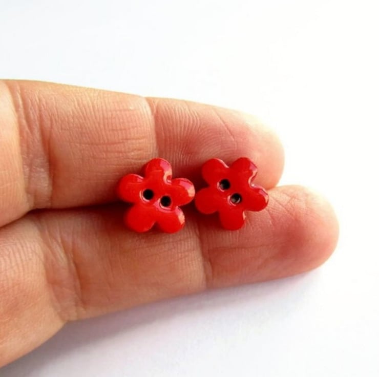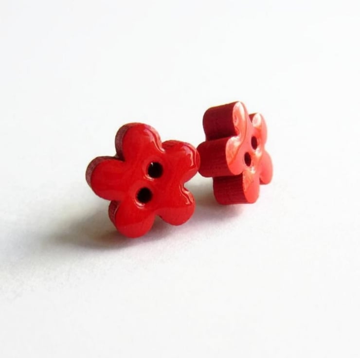 These fun, bright red stud earrings are handmade from upcycled wooden flower buttons. The little chunky daisy style flower buttons are securely set on hypoallergenic surgical steel posts with a layer of resin, with a further layer of shiny resin on the front. They make a cute gift for anyone who loves to sew or craft!
