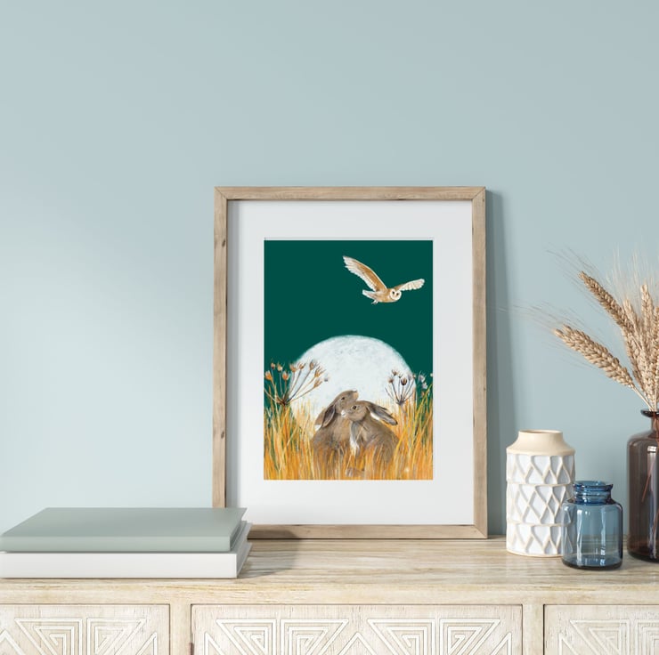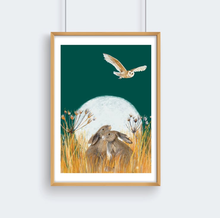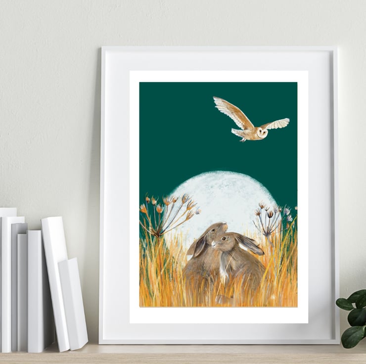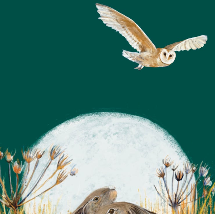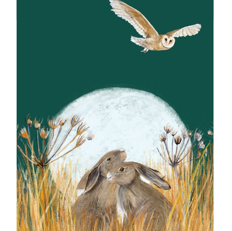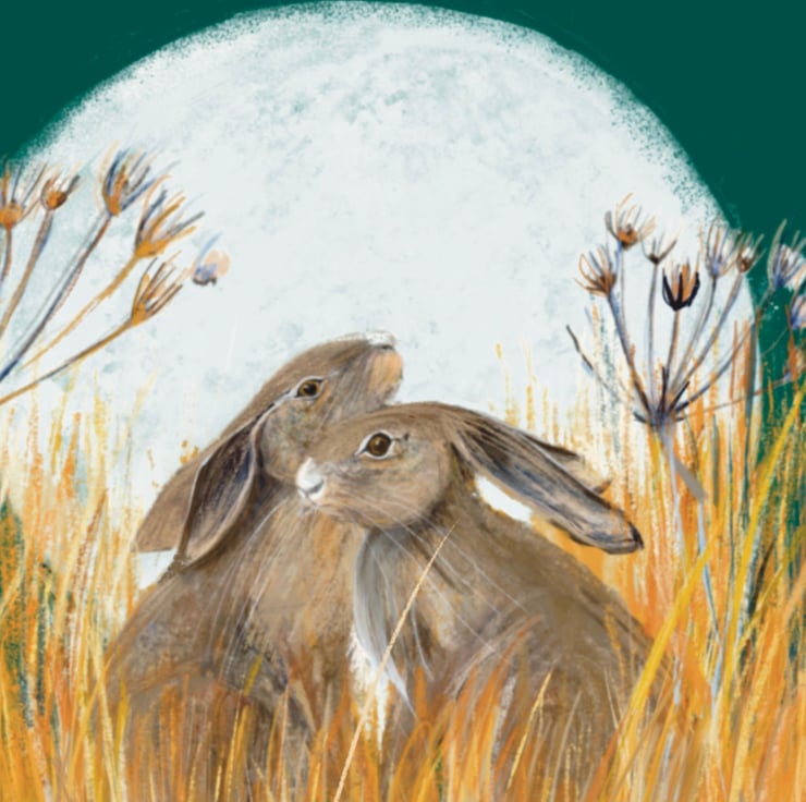 This piece started as a painting on a wood off cut. From there I took the image of the hares and used digital painting techniques to create a new piece of art work.