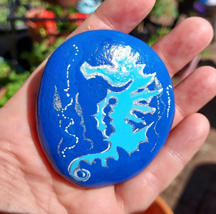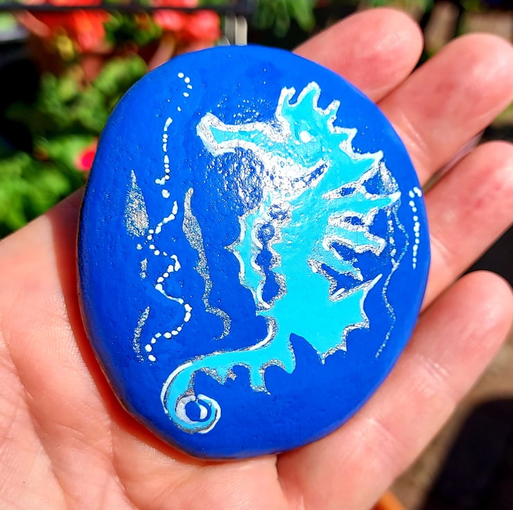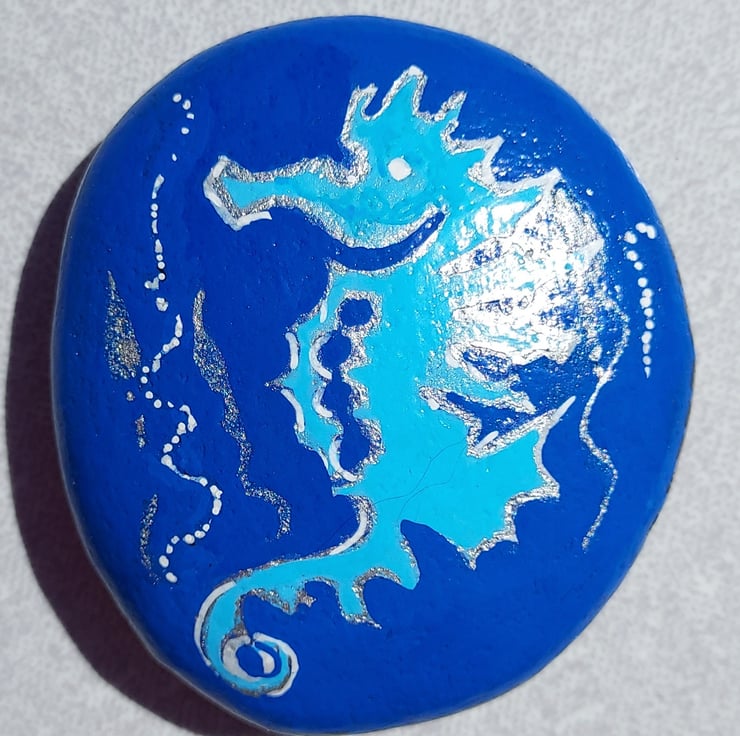 This a colourful Seahorse on a Bright Blue background painted on this beautiful real stone.