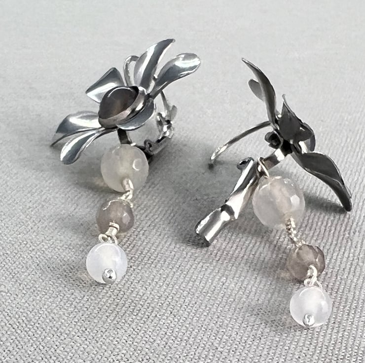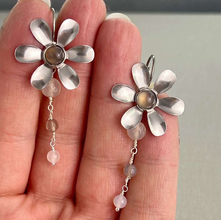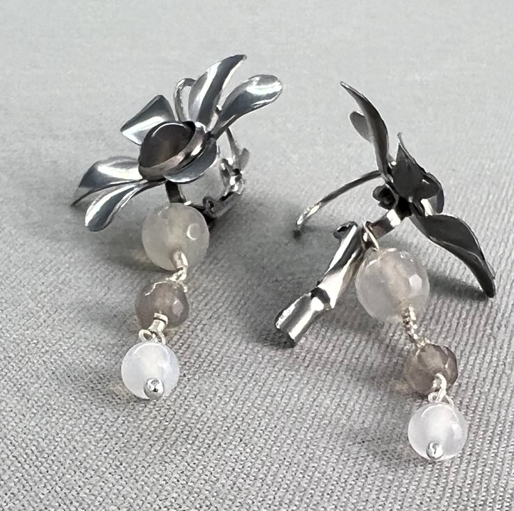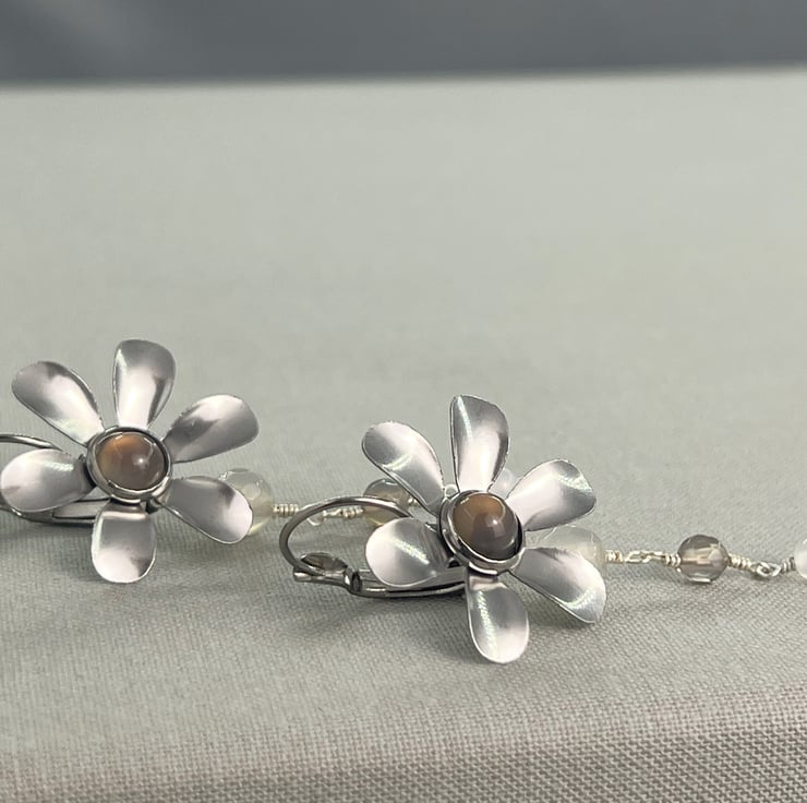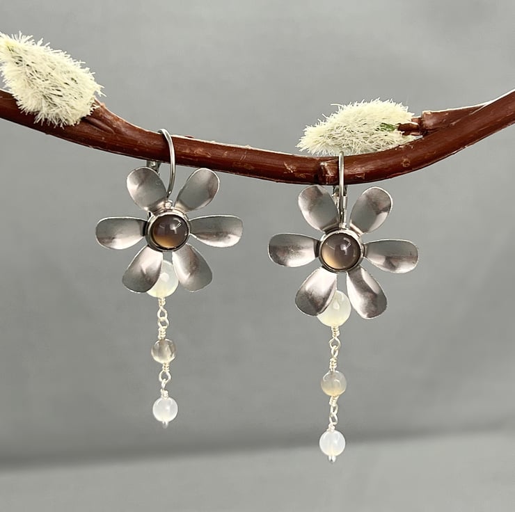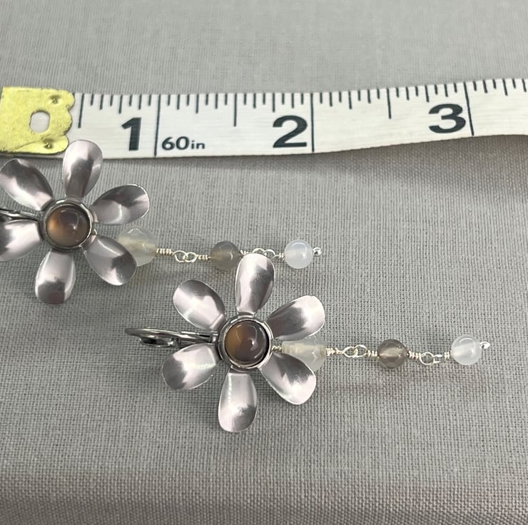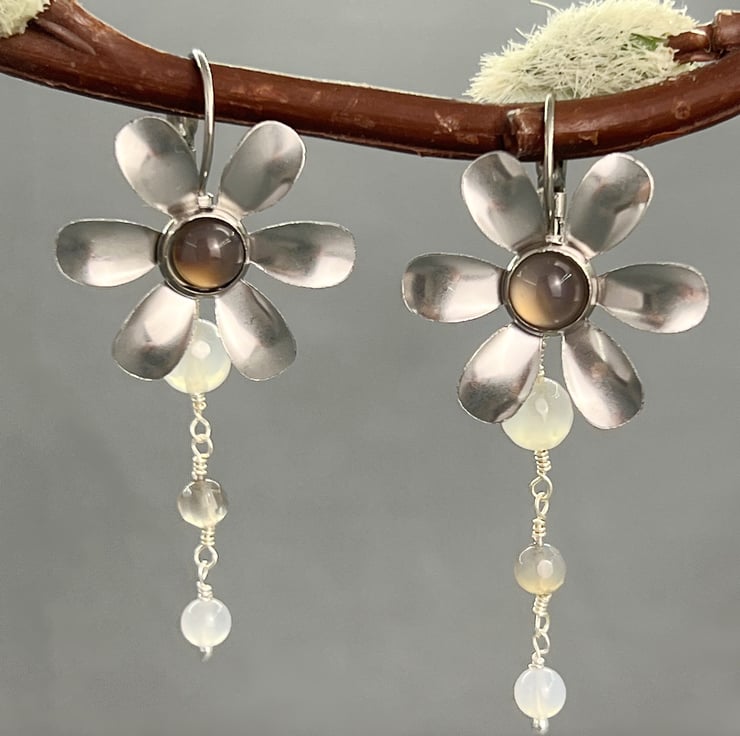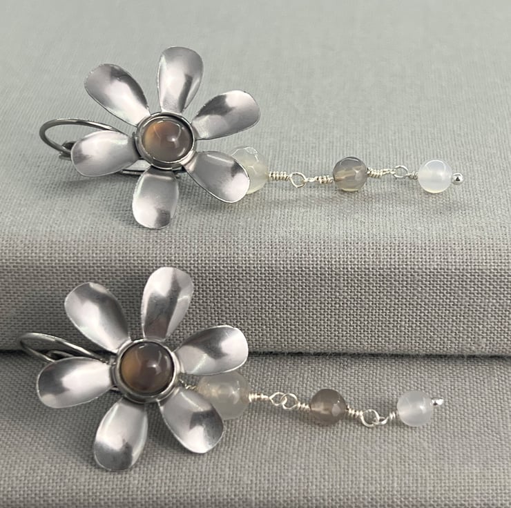 A stunning pair of lever back earrings featuring a metal flower that’s made from stainless steel, with a bezel set of grey agate. 3 further agates are added below the flower.