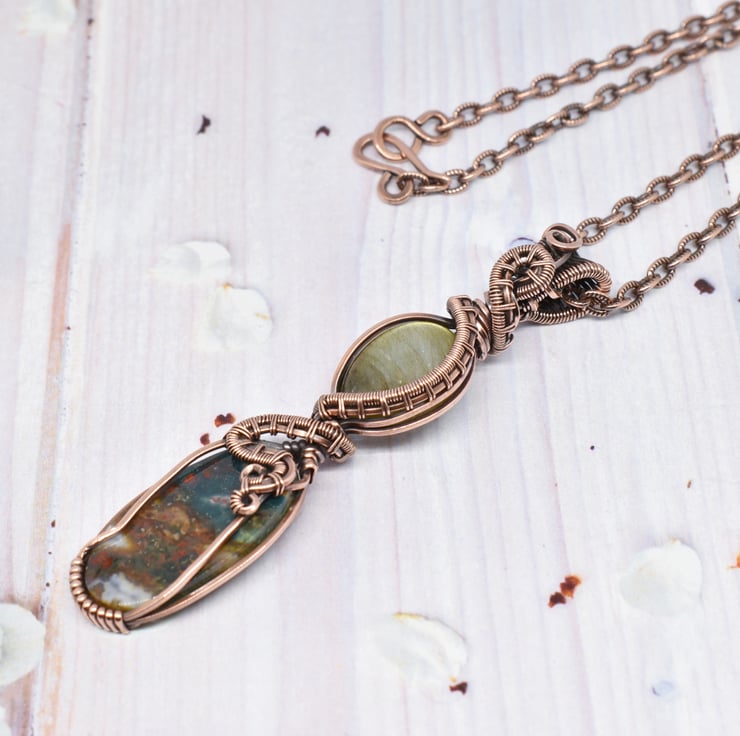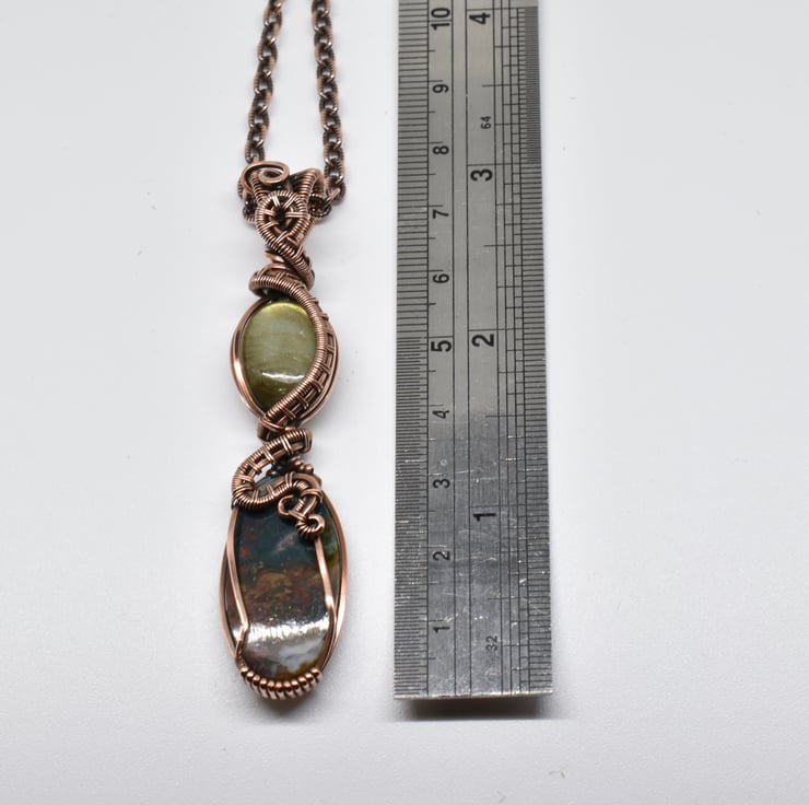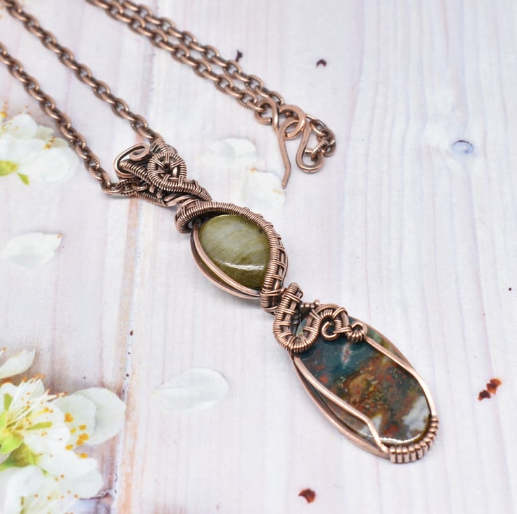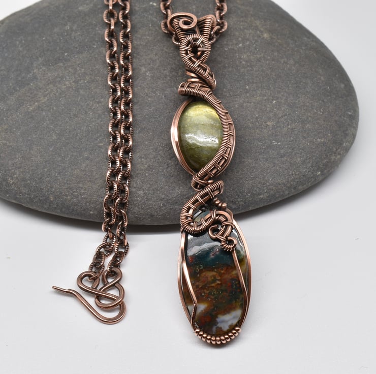 I have wrapped and woven around these beautiful stones with solid copper wire to make this striking double stone pendant.
