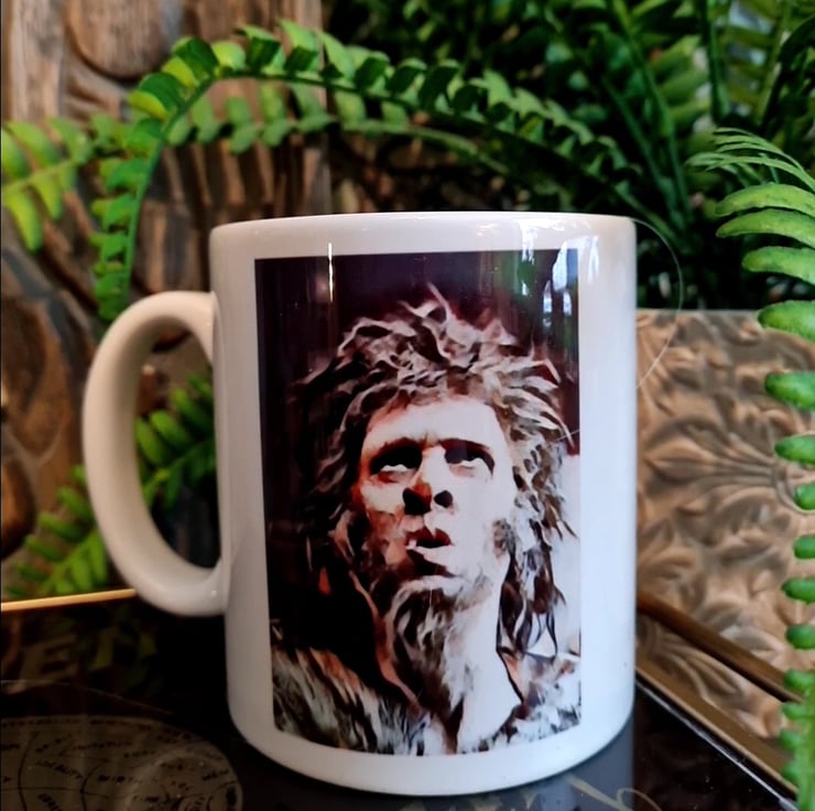 A lovely ceramic mug/cup featuring Laurence Rickard as dead caveman Robin in the brilliant BBC sitcom Ghosts, from an original design by Jayne Tunnicliffe.