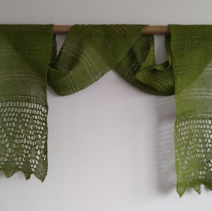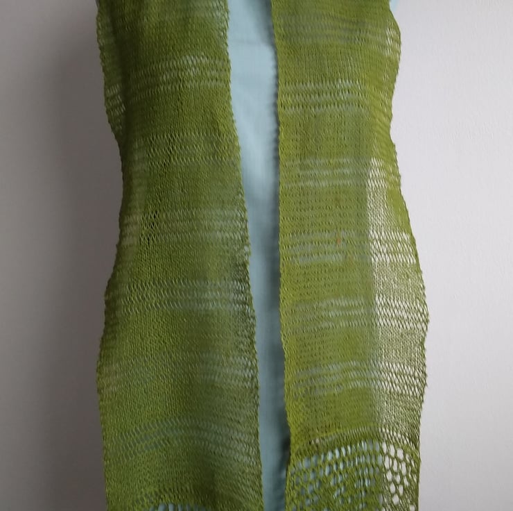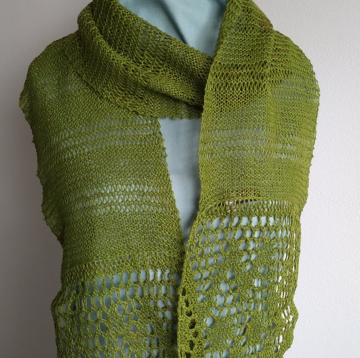 This scarf has been knitted by hand in a lightweight pure linen yarn. With lace pattern borders and an openwork body it makes a lovely accessory for spring and summer.